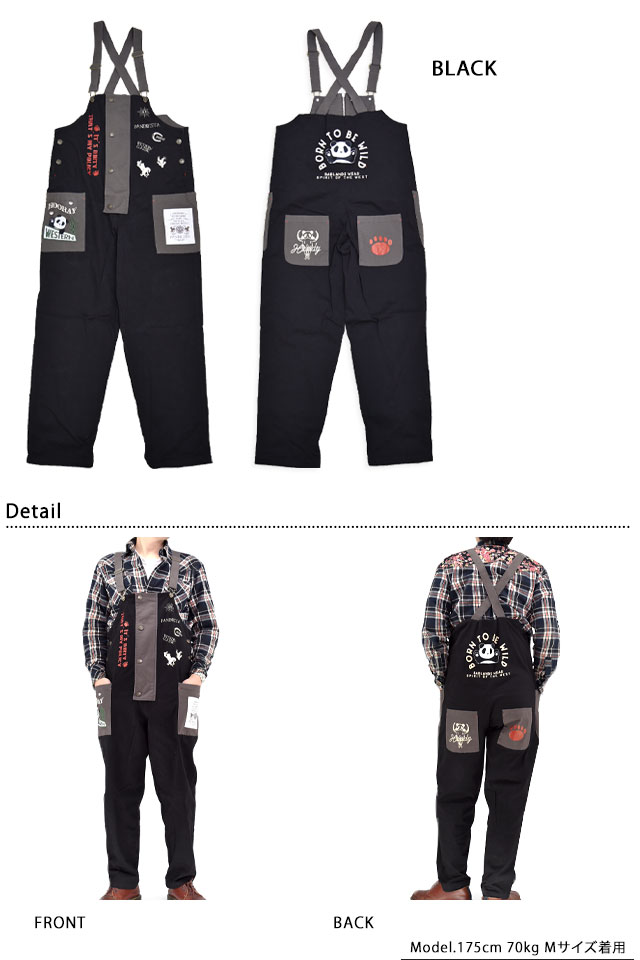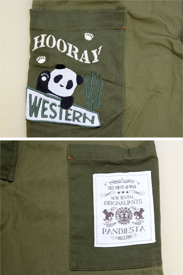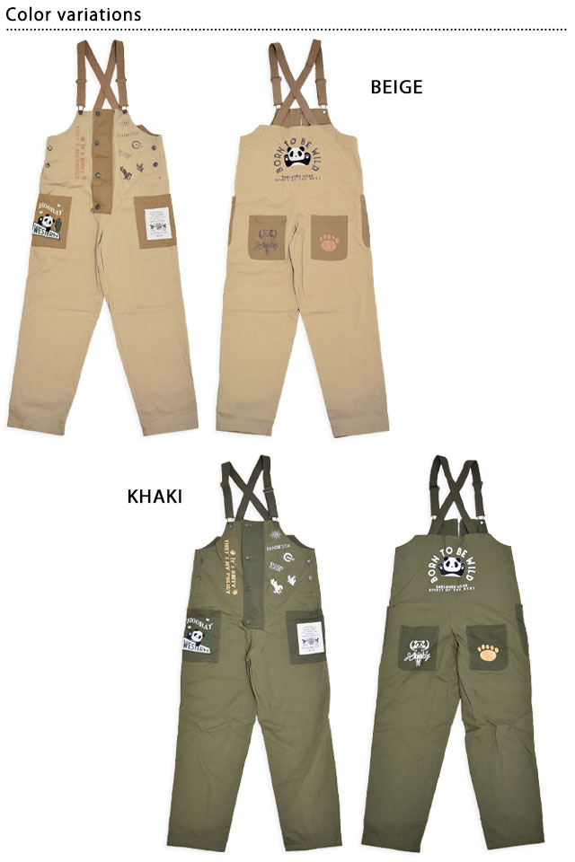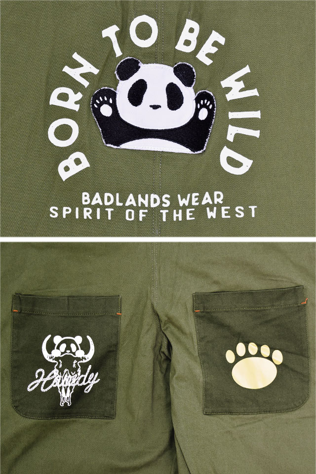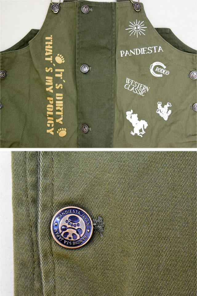 和柄ブランド【錦】の姉妹ブランドとして誕生した、お茶目なパンダをモチーフとした【PANDIESTA JAPAN】より「ミリタリーツイルオーバーオール(575954)」のご紹介です。 ツイル生地をベースに採用し、配色切り替えが魅力的なミリタリーオーバーオールが登場しました。 ミリタリー感溢れるステンシルプリントを用いて、ブランドロゴやアイコンをデザイン。 ポケットのパンディエスタは刺繍で表現されています。 ボタンにはパンダが刻印されたオリジナルボタンを使用。 フロントの柄やポケットのパンディエスタなど、ウエスタンをモチーフに取り入れたデザインがアクセントになっています。 | ||||||||||||||||||||
