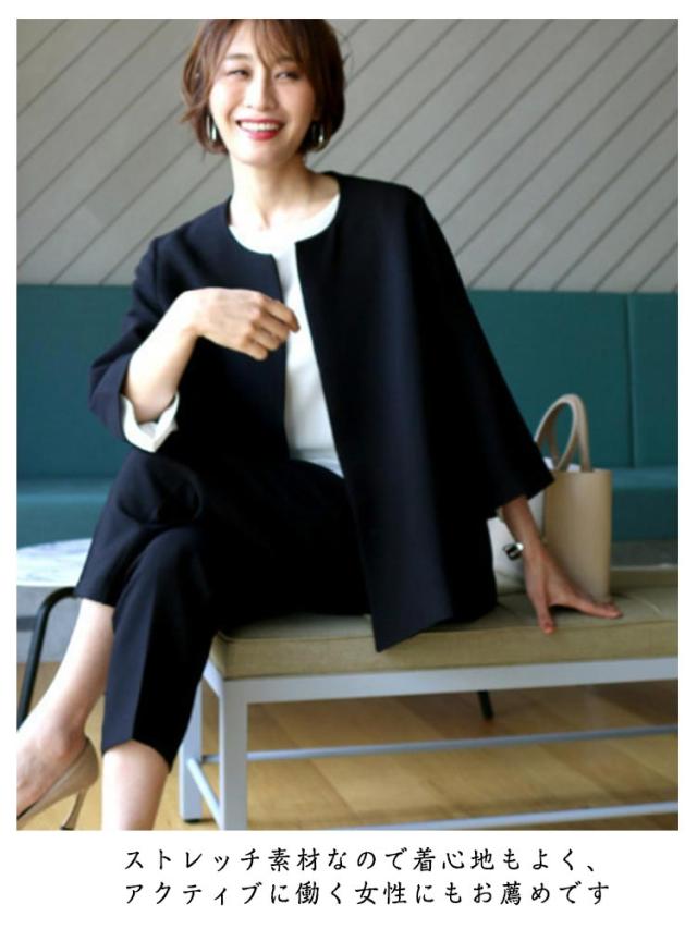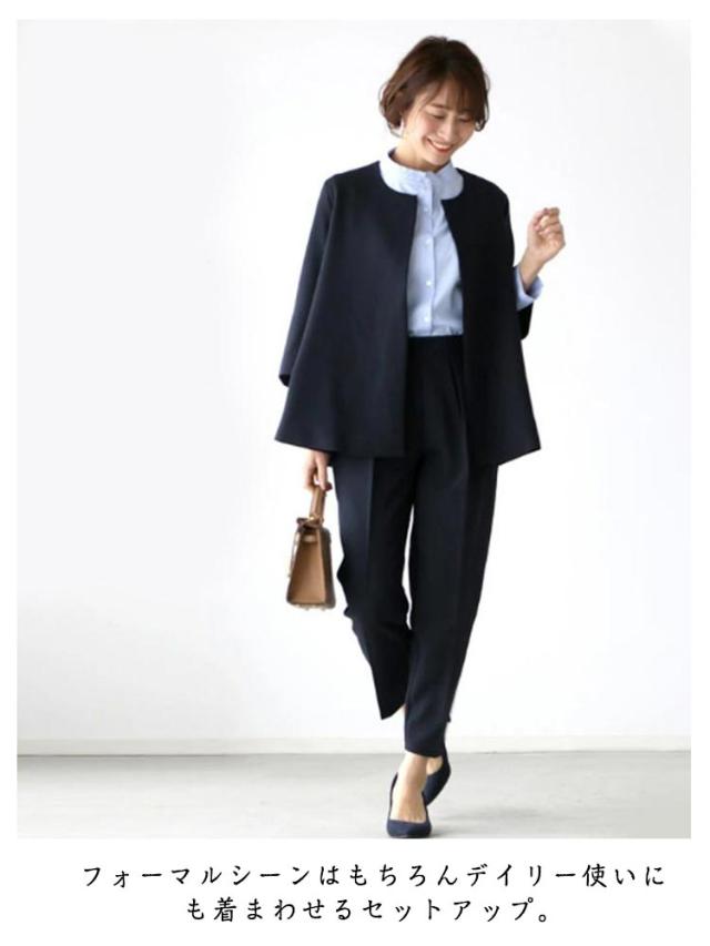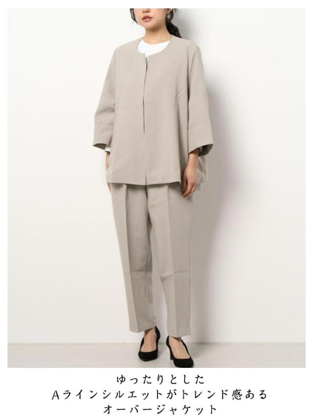| 上品さと実用性を兼ね備えた女性らしいスーツセット ゆったりとしたAラインシルエットがトレンド感あるオーバージャケット パンツはセンターにタックが入っており、ヒップとお腹周りをすっきり見せてくれるテーパードパンツタイプです。 フォーマルシーンはもちろんデイリー使いにも着まわせるセットアップ。 ストレッチ素材なので着心地もよく、アクティブに働く女性にもお薦めです | |
