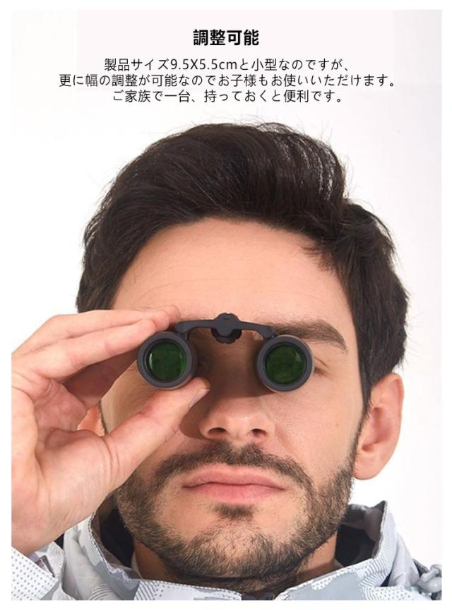 | 収納ケース付き 双眼鏡 20倍 ★本体重量170gの超軽量を実現★ 本体重量がわずか170gと超軽量でコンパクトな双眼鏡なので、コンサート、ドーム、ライブ、旅行のお供にもってこい!女性やお子さんも長時間持っても疲れない。 ★調整可能★ 製品サイズ9.5X5.5cmと小型なのですが、更に幅の調整が可能なのでお子様もお使いいただけます。ご家族で一台、持っておくと便利です。 ★光学レンズ20倍で感動も20倍★ 席がステージから遠すぎて大好きなアーティストが・・・なんて事ありますよね…。 20倍のレンズとは500m先の人を裸眼で25m先から見るのと同じ大きさで見えるという事。 これからは臨場感も感動も見逃しません。 ★付属品★ ネックストラップ,安心して山、海、コンサート、野球観戦、運動会に持ち歩けます。 専用ケース付き,専用収納ケースがついているので保管時の埃対策も心配不要です。 レンズ拭き用クロス,紋や油汚れをクリーナー液を使わずに一拭きスッキリ! 使用方法: 1.左視界がクリアになるまで、中心のピントを丁寧に調整してください。 2.映像が消えるまで、右目のレンズをゆっくりと調整してください。 | |