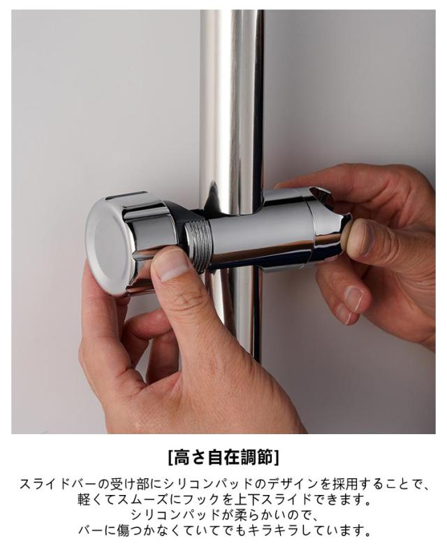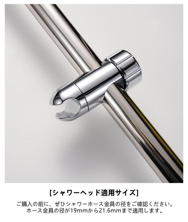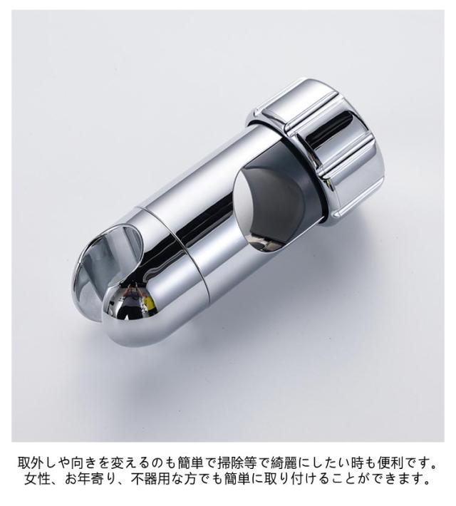| バーを外さなくても取り付け可能 高さ・角度自在調節可能 直径30mm~32mmのスライドバーに適用 修理交換用シャワーフック 【2個セット】 [取付簡単] バーを外しなくても取付できる後付けタイプです。 ハンドルを軽く回して固定部をバーに合わせて設置できます。 直径30mm〜32mmのスライドバーに適用します。 ご注文の前はスライドバーの直径をご確認ください。 (直径の測定方法:スライドバーの直径=(スライドバー)周囲/π)。 [高さ自在調節] スライドバーの受け部にシリコンパッドのデザインを採用することで、 軽くてスムーズにフックを上下スライドできます。 シリコンパッドが柔らかいので、バーに傷つかなくていてでもキラキラしています。 [シャワーヘッド適用サイズ] ご購入の前に、ぜひシャワーホース金具の径をご確認ください。 ホース金具の径が19mmから21.6mmまで適用します。 [メタル調表面仕上げ] 耐久性に強いABS素材を採用します。 製品が軽量で取付や使用に便利です。 洗練なクロムメッキ仕上げでバスルームに合わせやすいです。 取外しや向きを変えるのも簡単で掃除等で綺麗にしたい時も便利です。 女性、お年寄り、不器用な方でも簡単に取り付けることができます。 光沢あるメタリックシルバーとちょっと丸みを帯びたモダンなデザインは、どこにつけても高級感あるバスルームを演出します。 | |