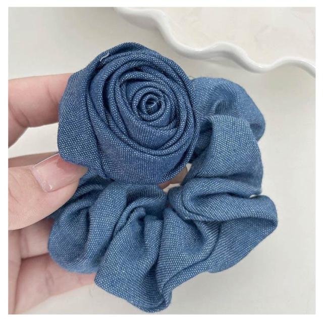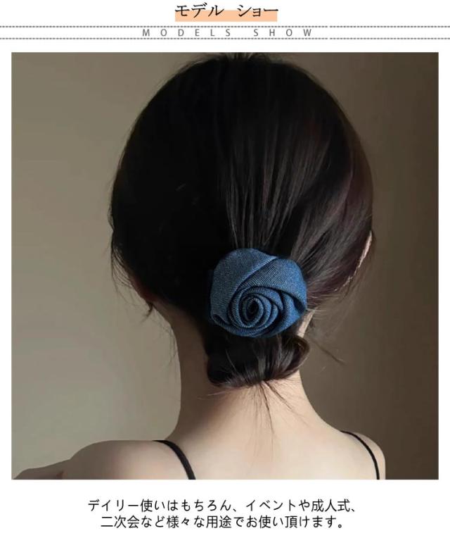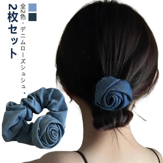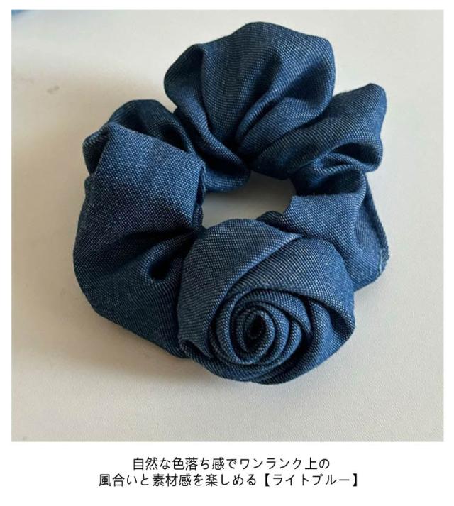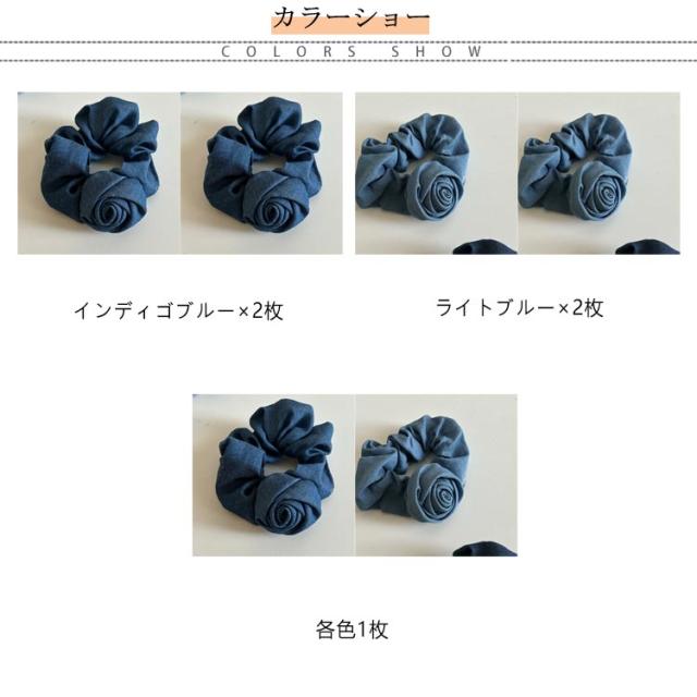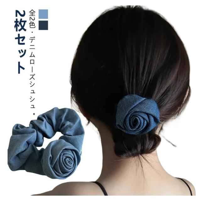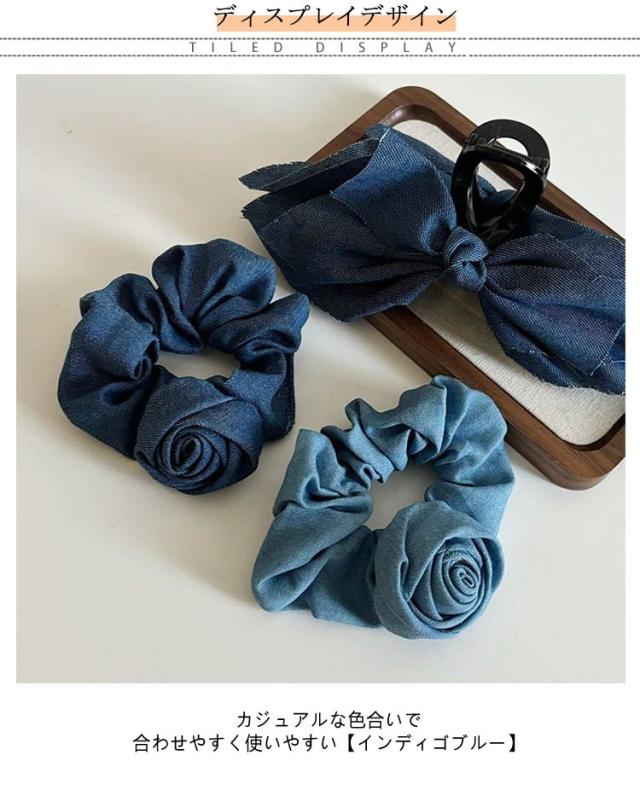 無地 【2枚セット】 きれいめ ブルー インディゴ 髪留め デニム 薔薇 シュシュ ヘアアクセサリー ライトブルー ヘアゴム ヘアアレンジ 髪ゴム 髪飾り パーティー 可愛い キュート ローズ アップスタイル レディース 女性 韓国 大人 子供 普段使い 【2枚セット】 上品