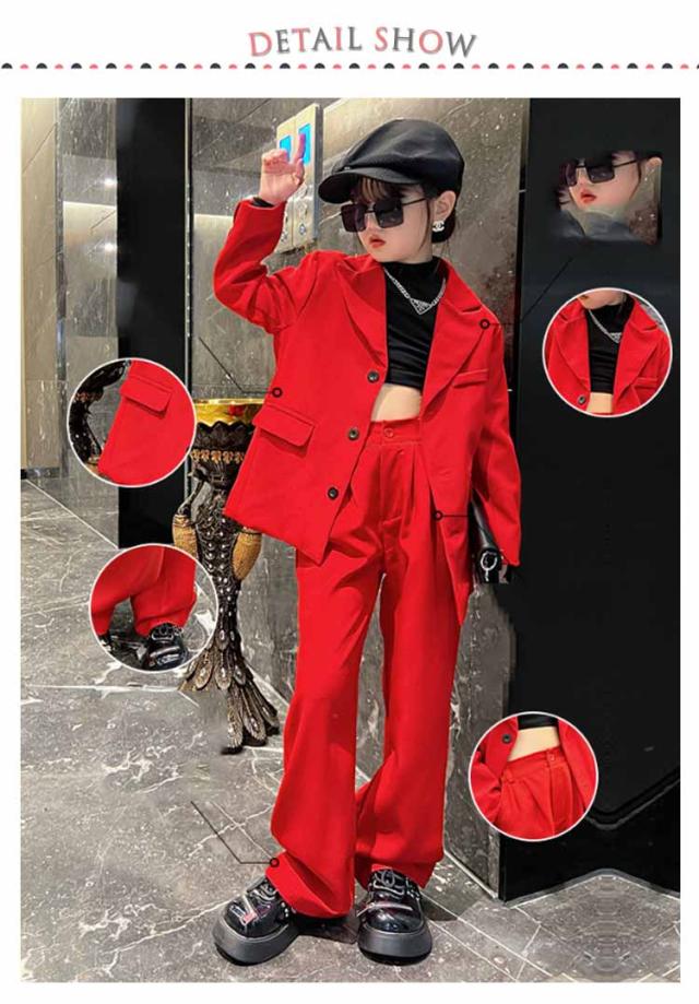 セットアップ 上下セット 長袖 女の子 ダンススーツ ダンス衣装 赤 黒 韓国 パンツスーツ ジャケット パンツ ダンス衣装 お祝い スーツ 子供服 長ズボン ブレザー 男の子 舞台 応援団 120-170cm ゆったり hiphop jazz