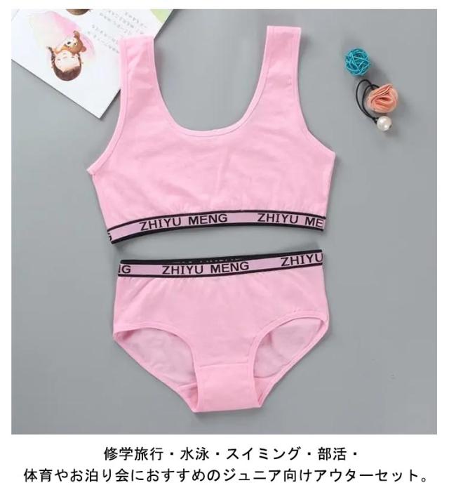 | 小学生高学年〜中学生向け女の子用下着。 スポーツブラとパンツの上下2点セットです。 綿素材で気持ちいい肌触り。 修学旅行・水泳・スイミング・部活・体育やお泊り会におすすめのジュニア向けアウターセット。 伸縮性のあるノンストレスな着心地。 新学期や新年に向けて新しい下着セットは色違いでも欲しくなっちゃう! | |