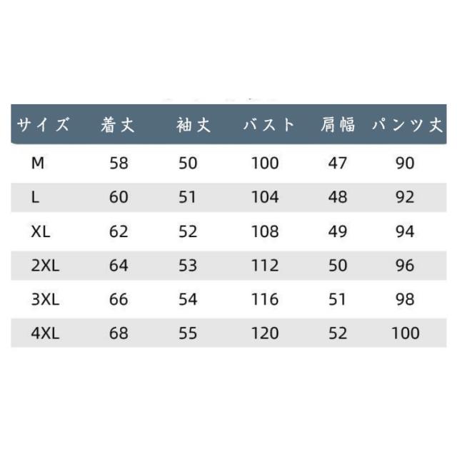| サイズについての説明 | M着丈58袖丈50バスト100肩幅47パンツ丈90おすすめ体重40-50KG L着丈60袖丈51バスト104肩幅48パンツ丈92おすすめ体重40-58KG XL着丈62袖丈52バスト108肩幅49パンツ丈94おすすめ体重58-65KG 2XL着丈64袖丈53バスト112肩幅50パンツ丈96おすすめ体重65-73KG 3XL着丈66袖丈54バスト116肩幅51パンツ丈98おすすめ体重73-83KG 4XL着丈68袖丈55バスト120肩幅52パンツ丈100おすすめ体重83-90KG ※サイズは平置き実寸になります。 サイズ表の実寸法は商品によって1-3cm程度の誤差がある場合がございます |