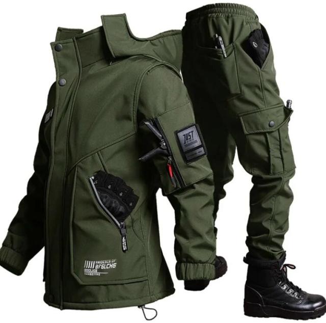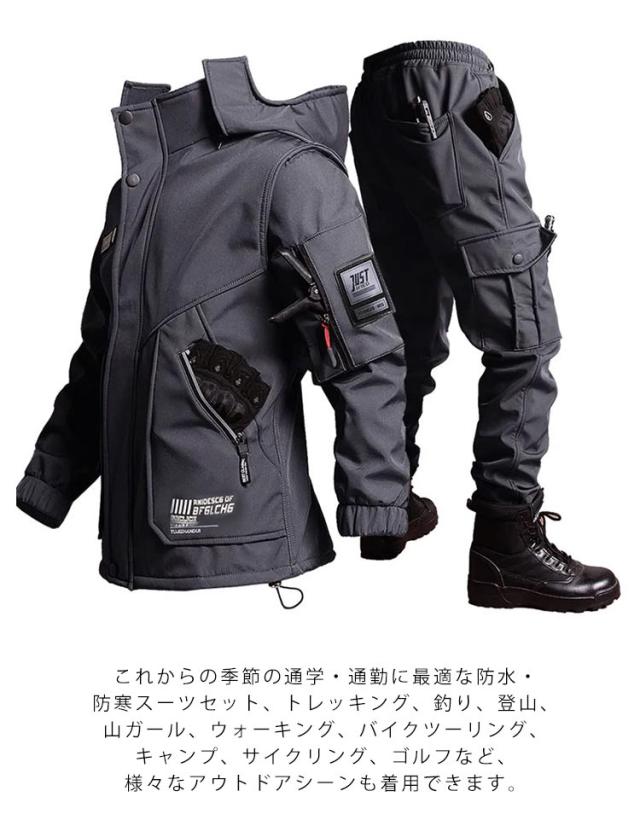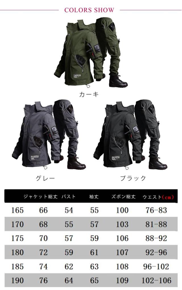 | 釣り、登山などアウトドアスポーツや屋外作業に最適!ミリタリー風裏起毛作業服上下セット。【3XLまで】 裏面優しい肌触りが特徴のボアフリースが使われているので風邪を通さず、保温性も兼ね揃えたアイテムに仕上げられております。 撥水加工で水を弾き、防風機能を備え生地からの冷たい風の侵入も防ぎます。 実用性の高いポケットがたくさん完備、手ぶらでお散歩なども◎ これからの季節の通学・通勤に最適な防水・防寒スーツセット、トレッキング、釣り、登山、山ガール、ウォーキング、バイクツーリング、キャンプ、サイクリング、ゴルフなど、様々なアウトドアシーンも着用できます。 | |