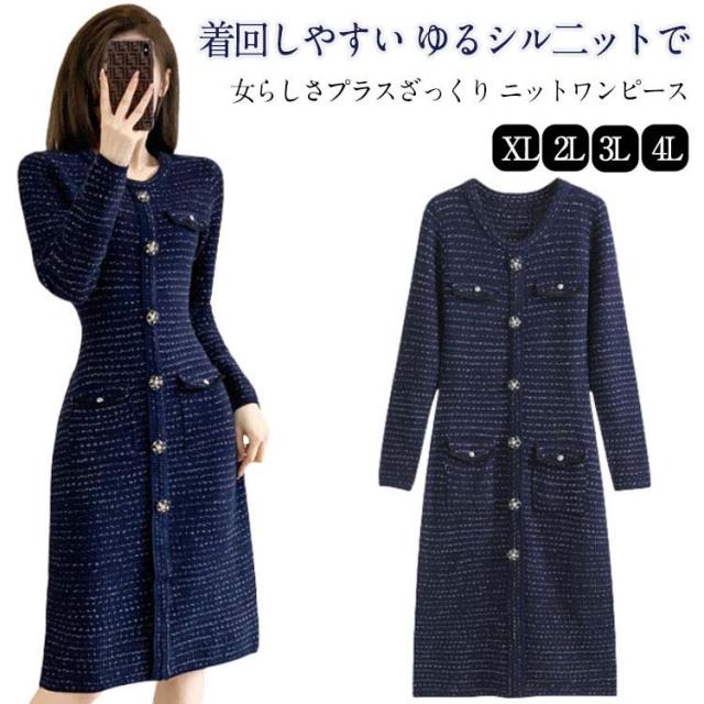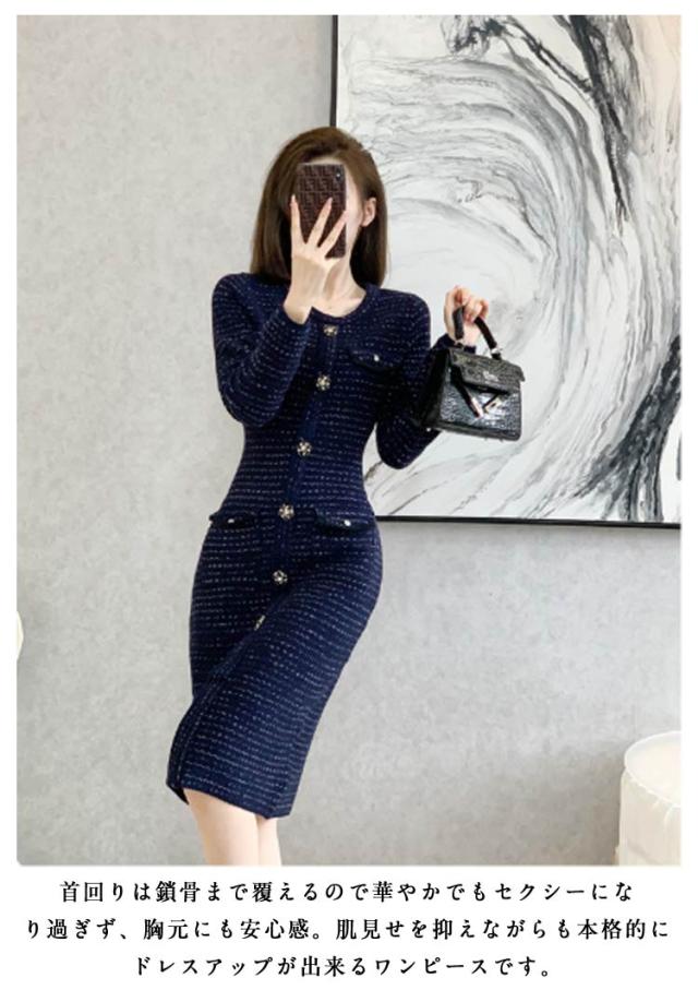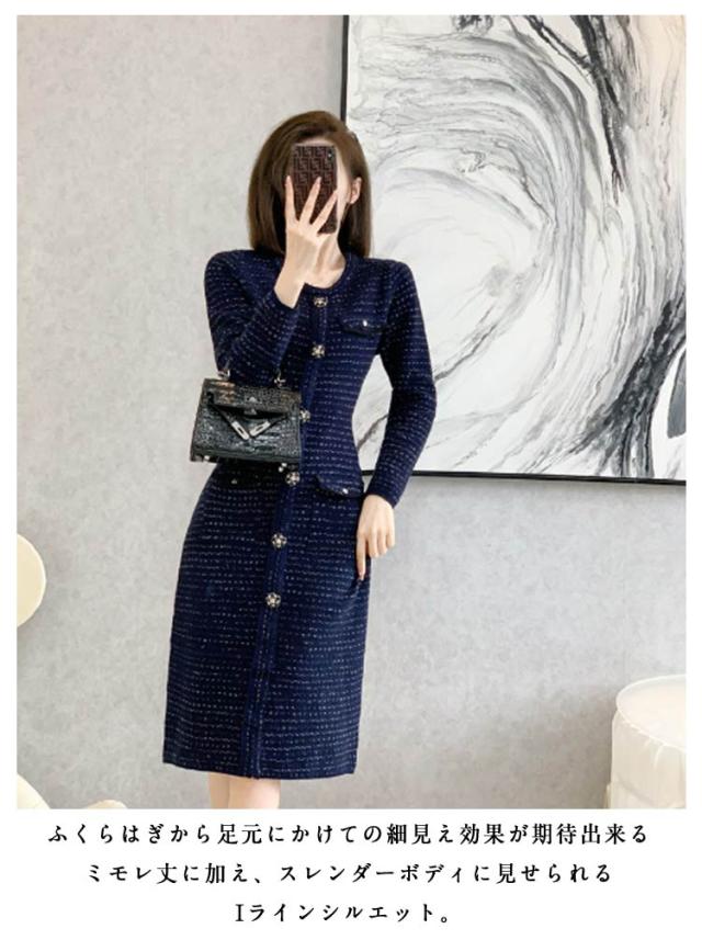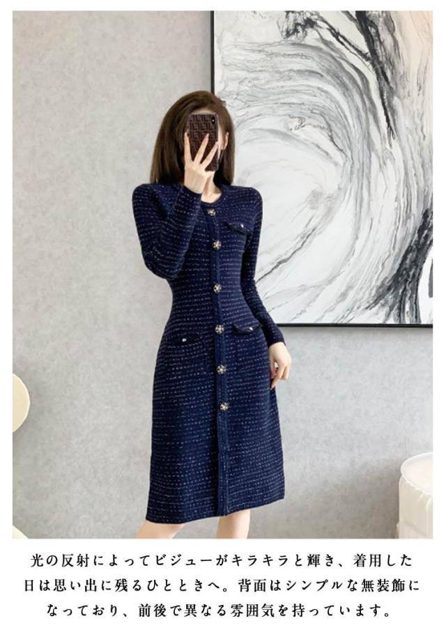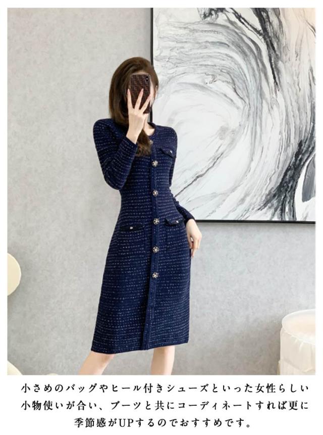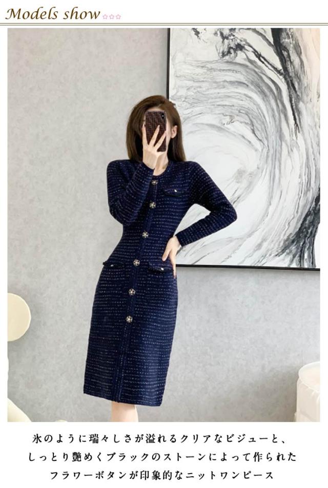 フラワーボタン ロングワンピース ニット 春服 春 フラワーボタン ニットワンピース 長袖 上品 フェミニン ロング きれいめ 春 大人 おしゃれ ワンピース お洒落 可愛い ツイード風 フォーマル