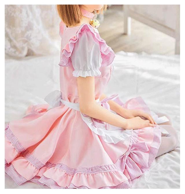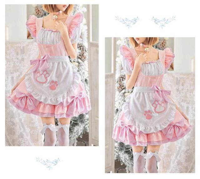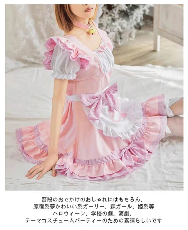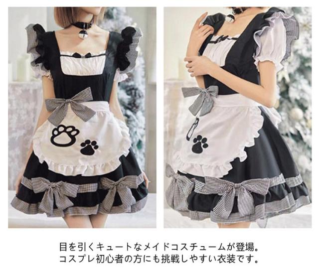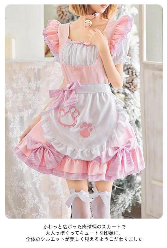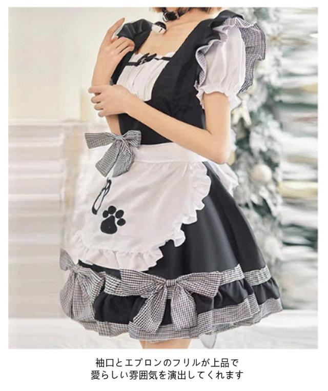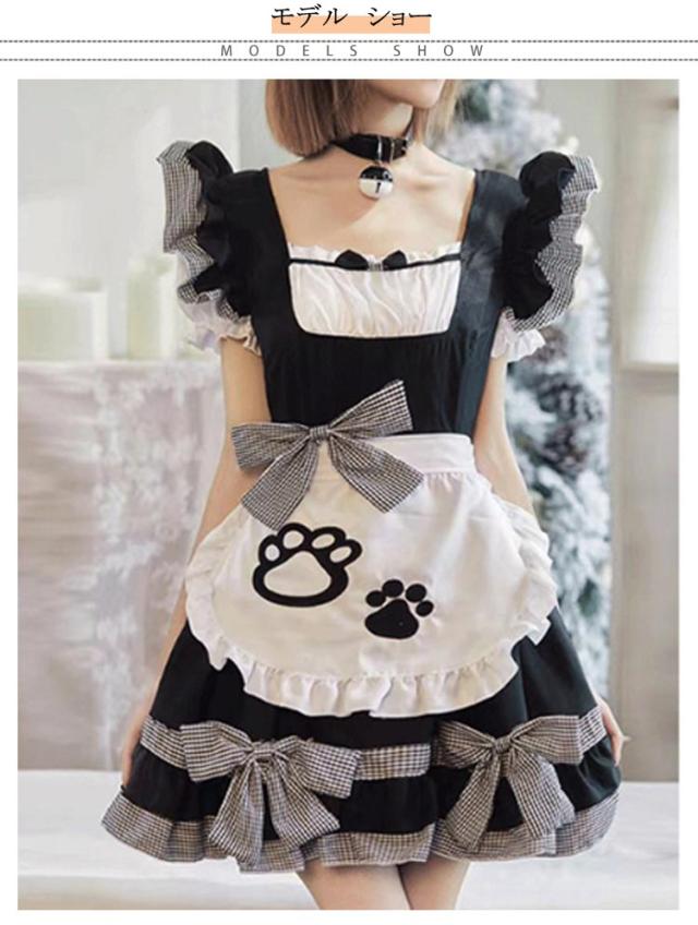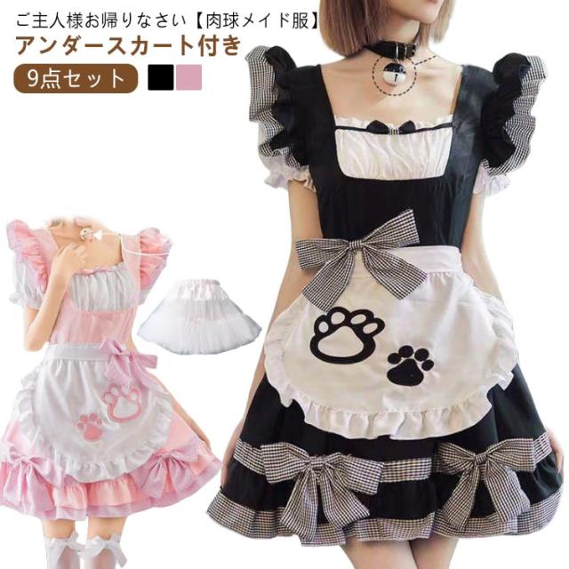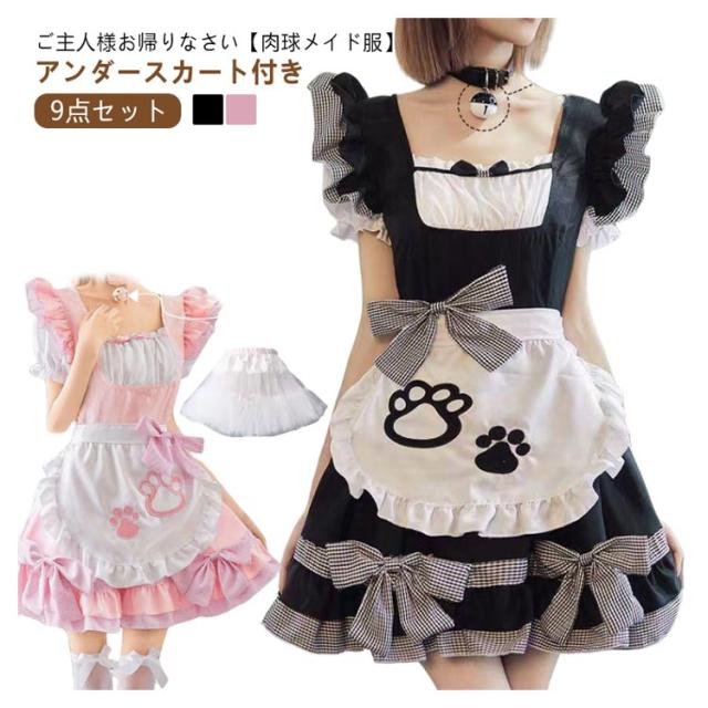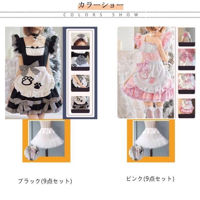 フリル リボン メイド服 リボン 萌え 女の子 制服 女性 仮装 肉球 ハロウィン 猫 セクシー 可愛い 黒 ピンク ゴシック 大人 子供 コスプレ レース パニエ付き コスチューム おしゃれ パーティー ロリータ 【9点セット】 喫茶 漫画 膝丈