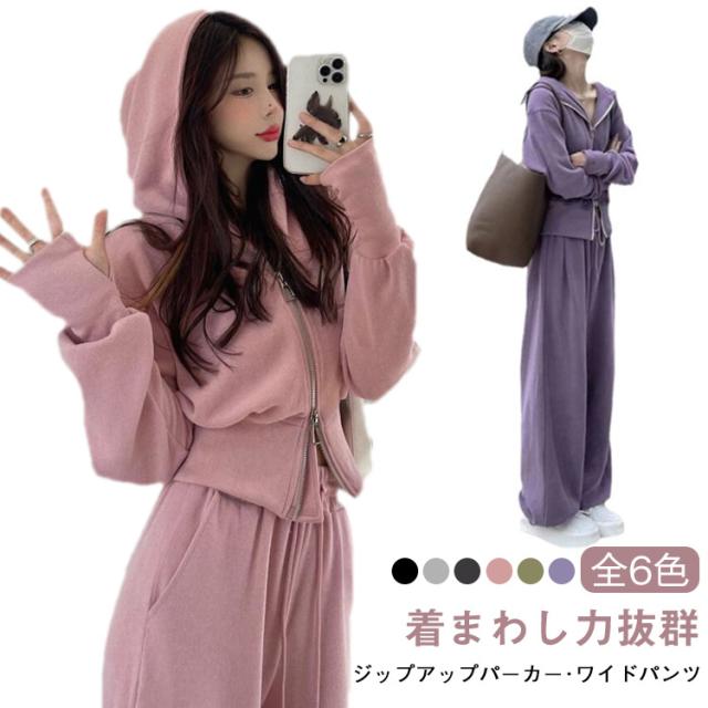 カジュアル セット ジップアップ ゆったり スポーツウェア カジュアル ワイドパンツ 上下セット 全6色 部屋着 ルームウェア テレワーク