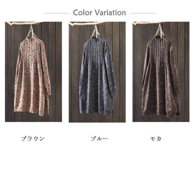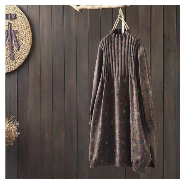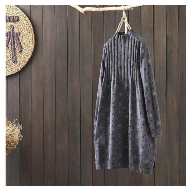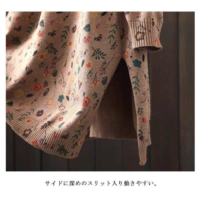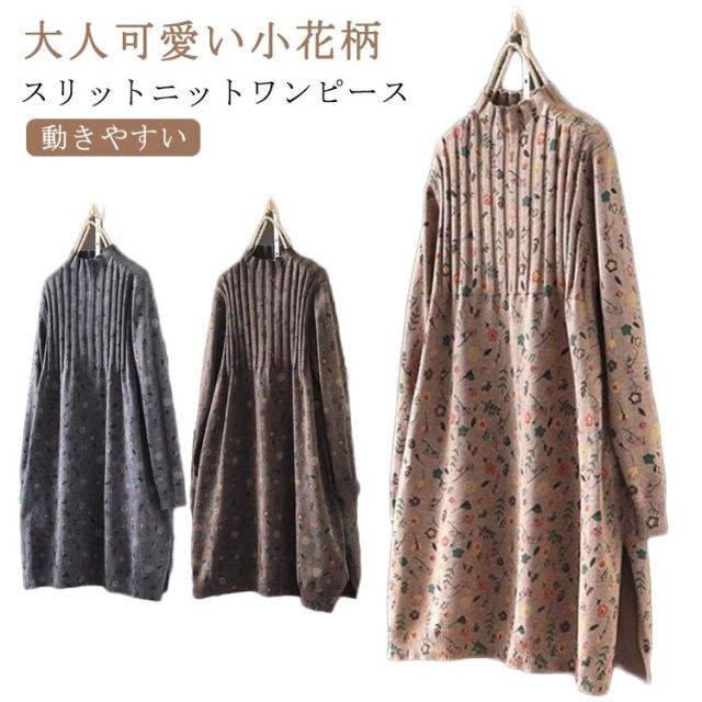 ハイネックセーター ニットワンピ 秋冬 ニットワンピース スリット ゆったり ヴィンテージ柄 花柄 チュニック ワンピース ハイネック ナチュラル カジュアル 森ガール