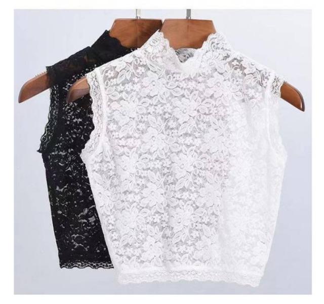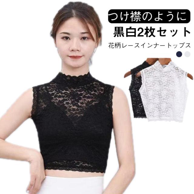 プチハイネック 女性向け 重ね着 総レース 花柄レース ショート丈 【黒白2枚セット】付け襟 レイヤード 夏 インナーシャツ レース素材 偽襟 インナートップス ノースリーブ ブラウス タンクトップ 春 秋 冬 【黒白2枚セット】付け襟 キレイめ