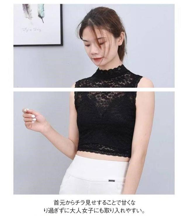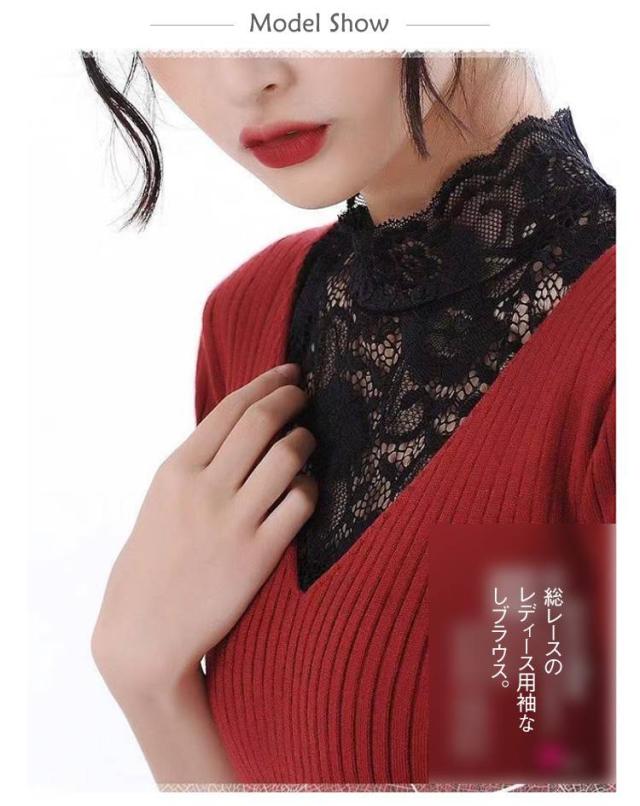 | 総レースのレディース用袖なしブラウス。 着るだけで上品で華やかな印象に早変わり、総レースのノースリーブインナーシャツ。 首元からチラ見せすることで甘くなり過ぎずに大人女子にも取り入れやすい。 着丈が短いのでつけ襟のようにもお使いいただける。 胸元が気になる服や、シンプルな服を手軽にスタイルチェンジしたい、レイヤード(重ね着)したいけど着膨れしたくない、等におすすめ。 | |