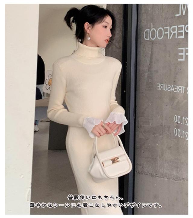 長袖 裾レース付きニットワンピース レディース タートルネック ワンピース 裾レース付きニットワンピース ロング丈 チュールワンピ ドッキング 異素材 ニットワンピース レース ハイネック 送料無料