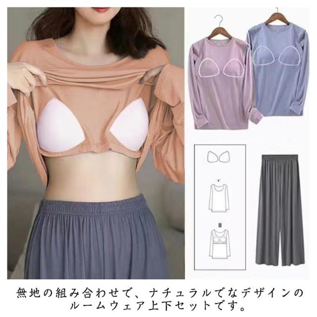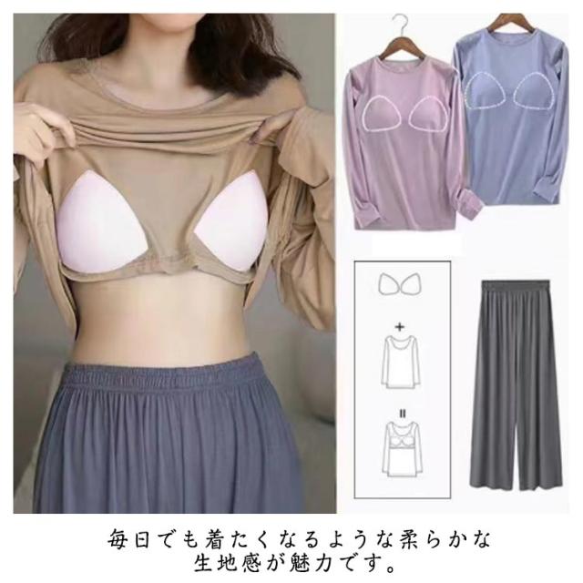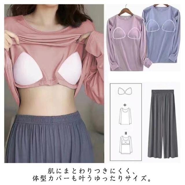 レディース パジャマ 寝間着 ブラ付き パジャマ 胸カップ 体型カバー 長袖 寝巻 女性 XL 部屋着 上下セット 春夏秋 ロングパンツ 2点セット ナイトウエア 部屋着 入院 産後 パジャマ ロンT カップ ズボン 大きいサイズ M L パジャマ 2XL 3XL 4XL