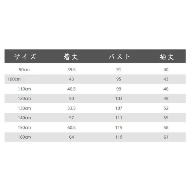 | サイズについての説明 | 100着丈43バスト95袖丈43 110着丈46バスト99袖丈46.5 120着丈49バスト103袖丈50 130着丈52バスト107袖丈53.5 140着丈55バスト111袖丈57 150着丈58バスト115袖丈60.5 160着丈61バスト119袖丈64 ※サイズは平置き実寸になります。 サイズ表の実寸法は商品によって1-3cm程度の誤差がある場合がございます |