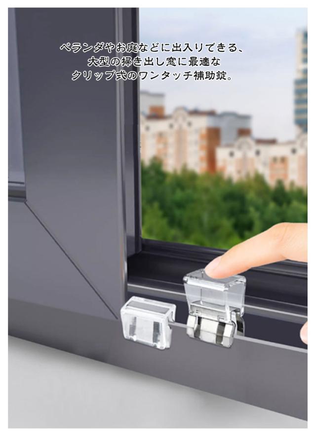 | お得な10個セット!サッシの溝に差し込んで、 押すだけで簡単に設置できる窓サッシ用補助錠セットです。 ベランダやお庭などに出入りできる、大型の掃き出し窓に最適なクリップ式のワンタッチ補助錠。 窓のサッシをしっかりロックして子供やペットを守る安心安全設計。 カギの開け閉めを覚えたばかりの小さなお子様のイタズラ対策や勝手に窓のカギを開けてしまう危険も防止。 取り付けは簡単で、換気しながらでもロックが可能です。 | |