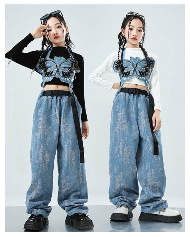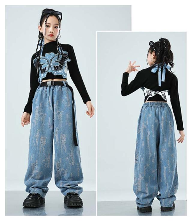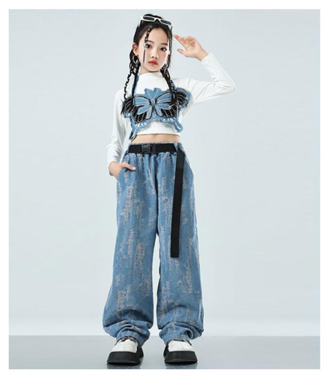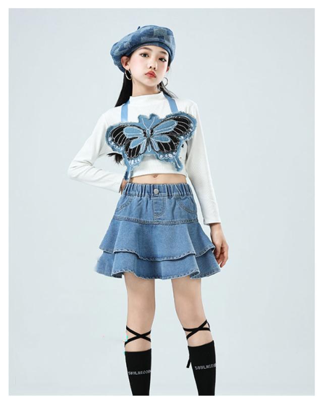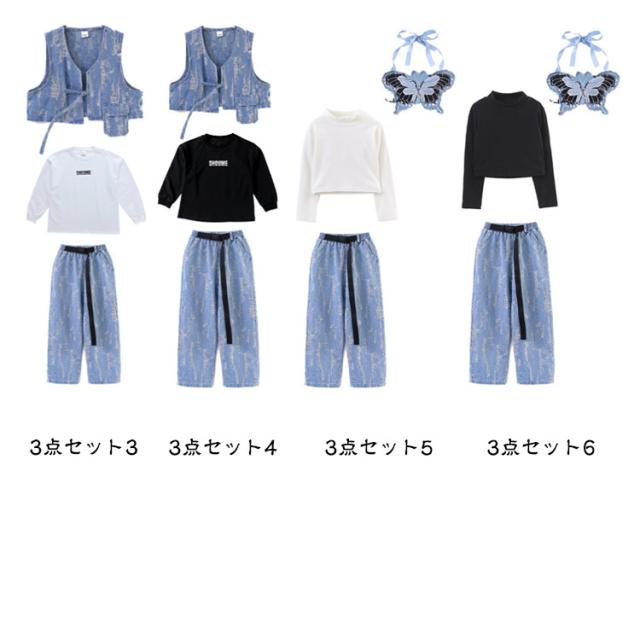 デニムパンツ ヒップホップ キッズ アイドル衣装 3点 衣装 k-pop トップス スカート チアダンス へそ出し 長袖 女の子 キッズ ショート丈 男の子 ダンス衣装 子供 演出 ジャズダンス HIPHOP 応援団 発表会 ステージ衣装 イベント