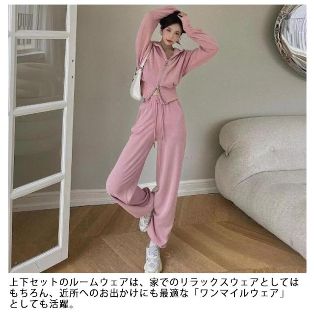 | フロントジップ仕様のため、ジップの開閉により簡単に温度調整ができるのが便利なポイント。 ズボンは伸縮性のあるウエストゴムで、締め付けず快適な穿き心地です。 ゆったりのサイズなのでリラックスできてよいです。 上下セットのルームウェアは、家でのリラックスウェアとしてはもちろん、近所へのお出かけにも最適な「ワンマイルウェア」としても活躍。 | |