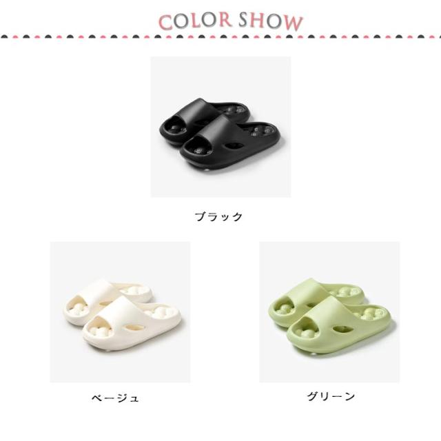 | ソフトな刺激で心地よい履き心地 軽量かつ柔らかい履き心地: ソフトな刺激で長時間履いても痛くならない 足つぼが苦手な方にも 足に優しい設計で歩きやすさも実現: 前足部・土踏まず・後足部それぞれに配置されたマッサージボール 厚い靴底で衝撃も吸収し歩きやすい 穴あきデザインでいつも清潔&防臭効果 気になる足元だからこそ水洗いで安心 靴底の通気孔による高い速乾性でいつでも清潔 普段使いしやすい安心機能: つま先をしぼったデザインで足先を保護 滑り止め設計で転倒も予防 | |