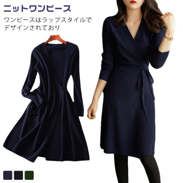 ニットワンピース タイト 結婚式ワンピース ラップワンピース 長袖 ワンピース vネック 冬 春 秋 ニットワンピース 大人可愛い 秋冬 二次会 お呼ばれ カジュアル ママ