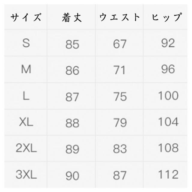 | サイズについての説明 | S 着丈85cm ウエスト67cm ヒップ92cm M 着丈86cm ウエスト71cm ヒップ96cm L 着丈87cm ウエスト75cm ヒップ100cm XL 着丈88cm ウエスト79cm ヒップ104cm 2XL 着丈89cm ウエスト83cm ヒップ108cm 3XL 着丈90cm ウエスト87cm ヒップ112cm |