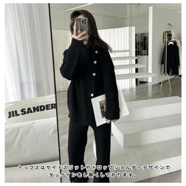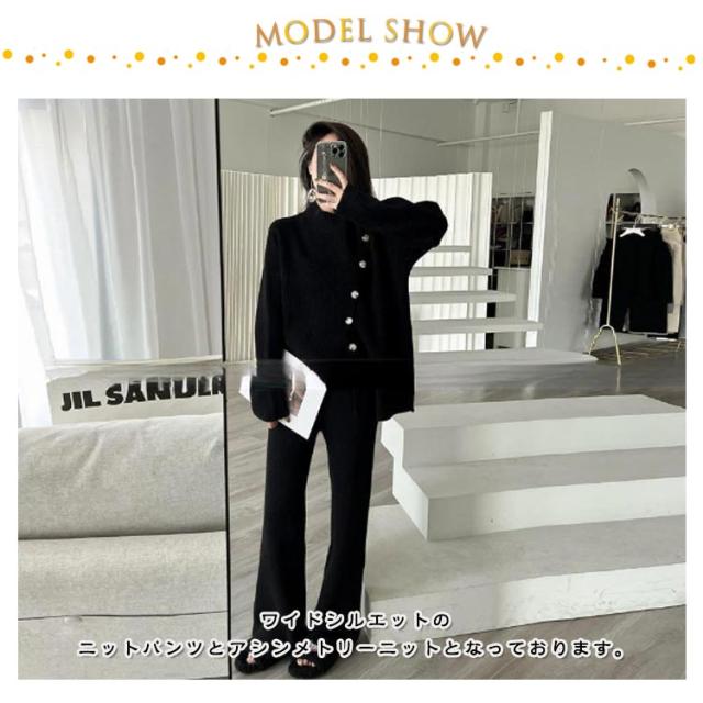 | スタイリッシュで快適な履き心地のニットセットアップ。 ワイドシルエットのニットパンツとアシンメトリーニットとなっております。 トップスはサイドスリットやドロップショルダーデザインでタックインをし易くしております。 パンツはリラックス感がありながらも、ストレートの美しいシルエットがこなれた印象をプラスします。 伸縮性と耐久性に優れた素材を使用したことで、ふんわりと優しく包み込まれるような着心地です。 コーディネートは楽なのにお洒落にキマるニットアップを、ぜひお試しください♪ | |
