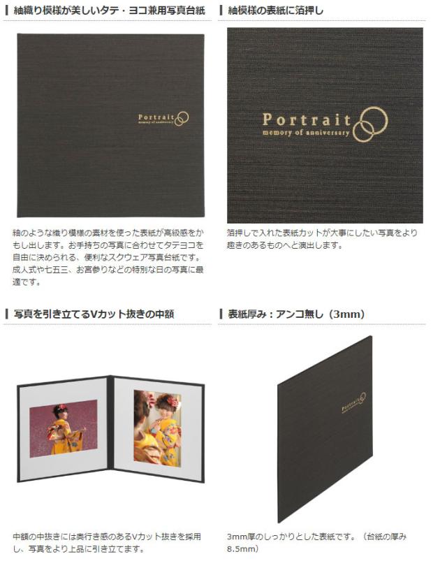 紬のような織り模様の素材を使った表紙が高級感をかもし出します。お手持ちの写真に合わせてタテヨコを自由に決められる、便利なスクウェア写真台紙です。成人式や七五三、お宮参りなどの特別な日の写真に最適です。
