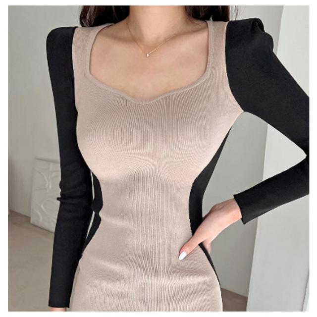 配色ワンピース 配色ワンピース 鎖骨 タイト Vネック デコルテ 長袖 ニットワンピ 細身 スリム タイト ニットワンピース 大人 上品 リブニット レディース ワンピ パーティドレス サイドスリット 綺麗め 細身 シンプル