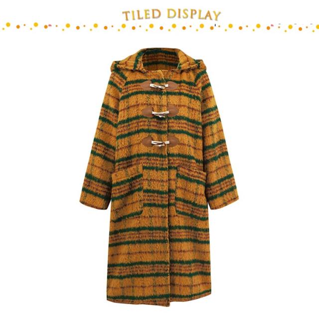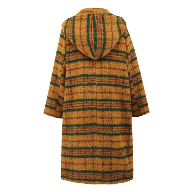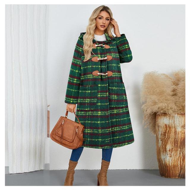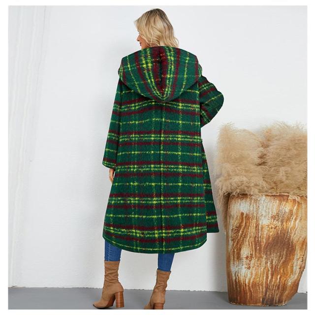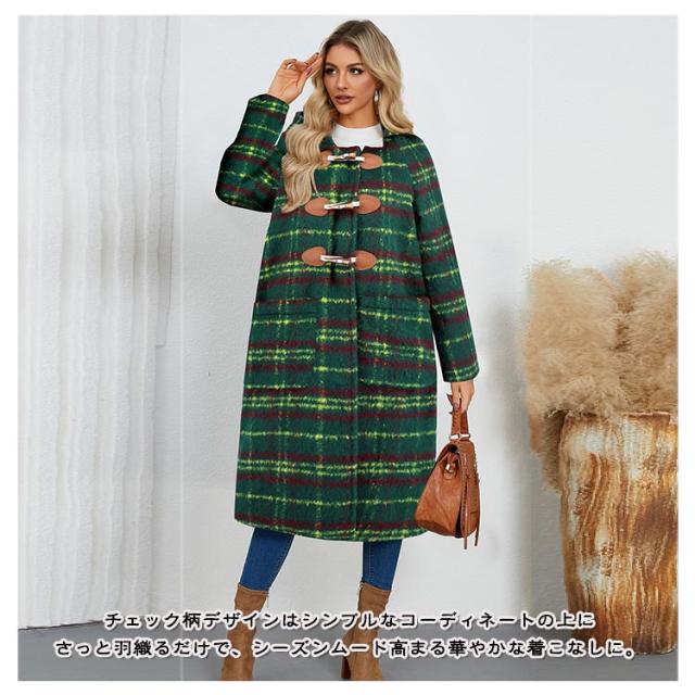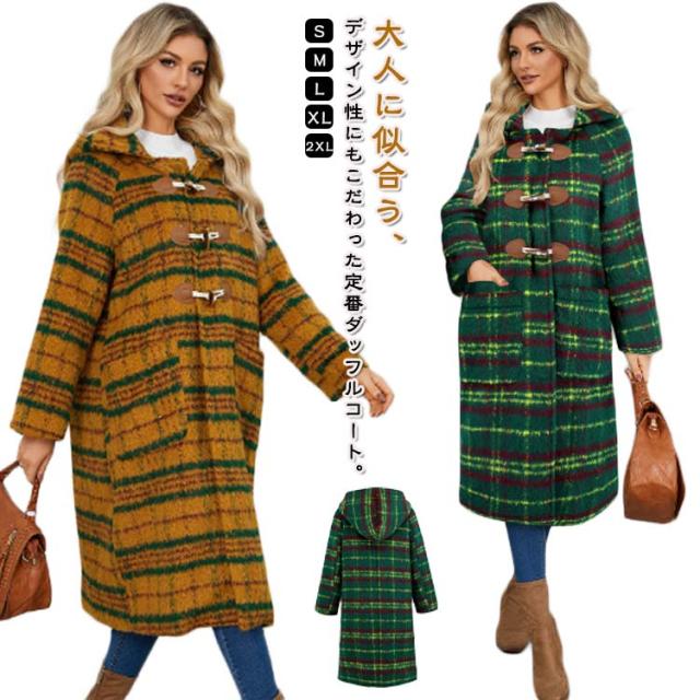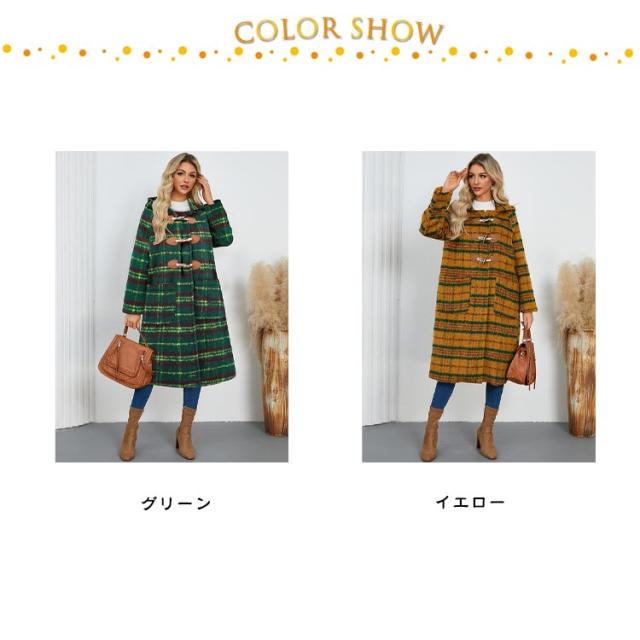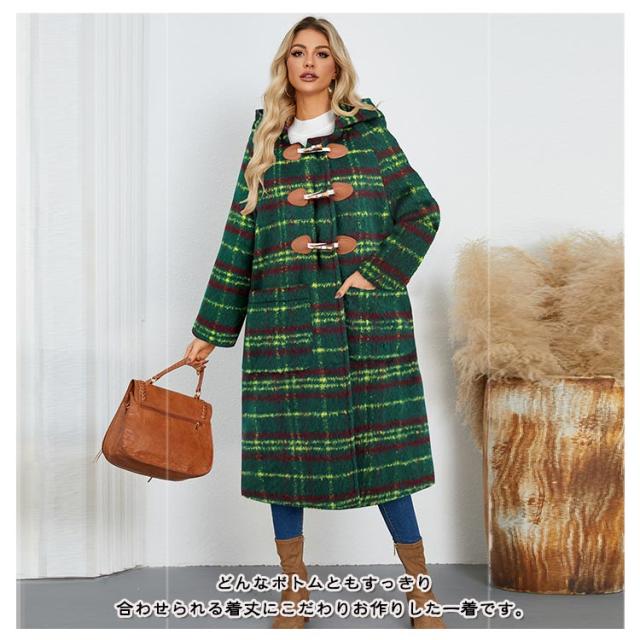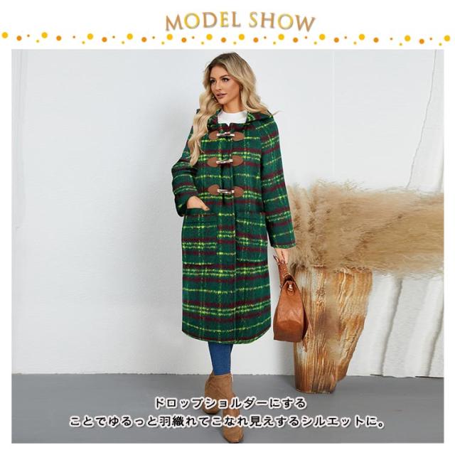 チェック柄 ロングコート アウター 防風 フード付き ドロップショルダー 上着 長袖 厚手 ダッフルコート 膝下丈ウールライク 暖かい 羽織り チェスターコート カジュアル きれいめ しわ防止 防寒 上品 おしゃれ ミセス 通勤 体型カバー グリーン