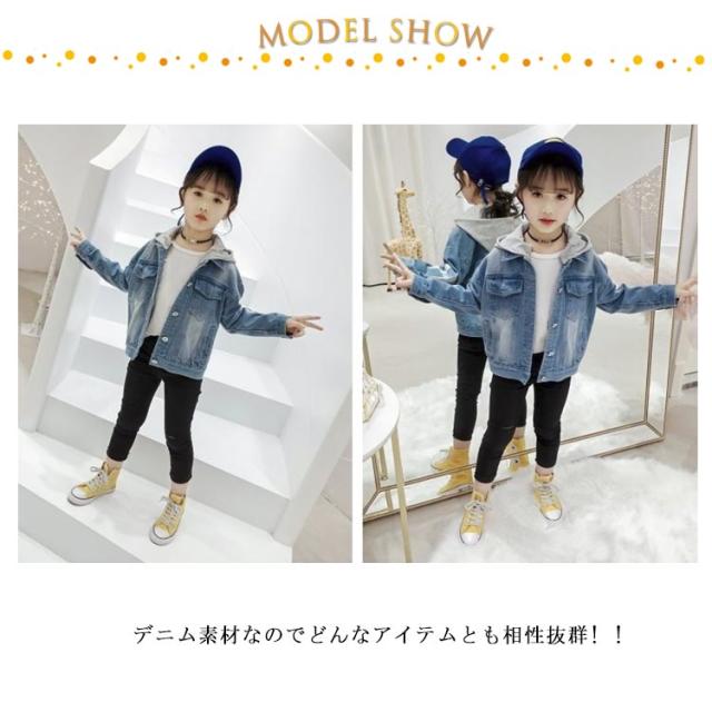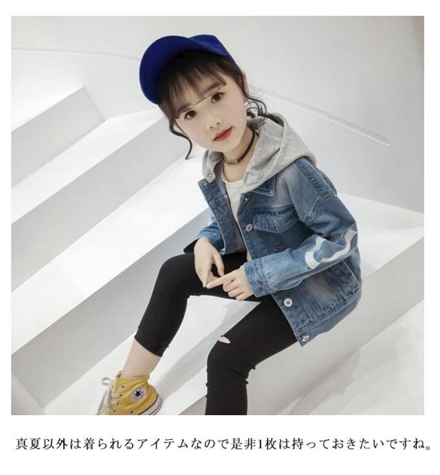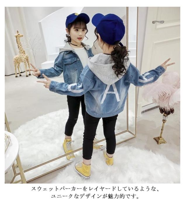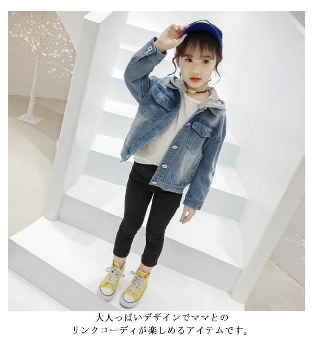 | キッズデニムジャケット デニム素材なのでどんなアイテムとも相性抜群! ! スウェットパーカーをレイヤードしているような、ユニークなデザインが魅力的です。 大人っぱいデザインでママとのリンクコーディが楽しめるアイテムです。 真夏以外は着られるアイテムなので是非1枚は持っておきたいですね。 | |