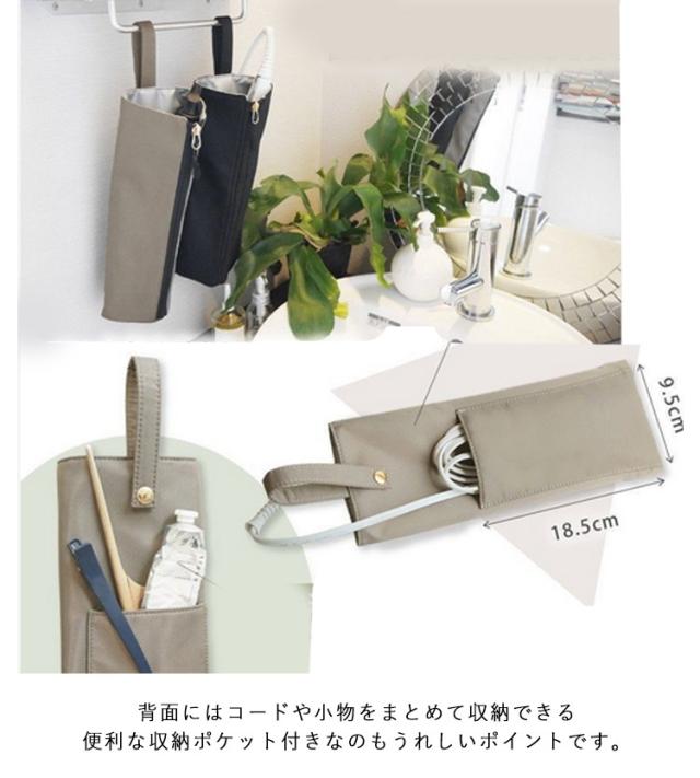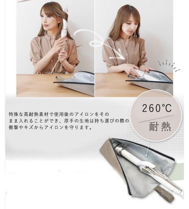 | ヘアアイロンが冷めるまで待たなくてもいい耐熱ポーチ。【耐熱260℃】 ファスナーで開閉できるポーチタイプなので、旅行になど持ち運びにも便利です。大きめのヘアアイロンでも安心です。 特殊な高耐熱素材で使用後のアイロンをそのまま入れることができ、厚手の生地は持ち運びの際の衝撃やキズからアイロンを守ります。 撥水加工で洗面所に吊り下げでも◎!また、洗面所に吊るしておけばアイロンをスムーズに出し入れもできます。 背面にはコードや小物をまとめて収納できる便利な収納ポケット付きなのもうれしいポイントです。 | |