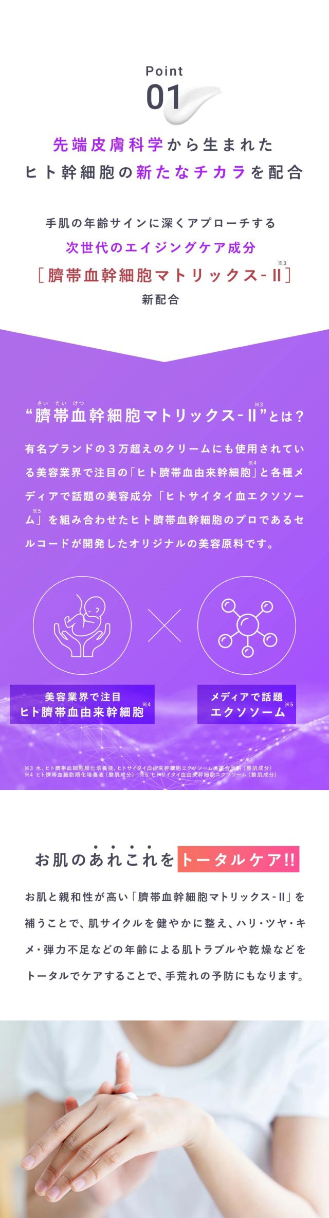 美容クリニックでも使用されている「ヒト臍帯血幹細胞」「エクソソーム」を贅沢に配合した美容ハンドクリームです。
