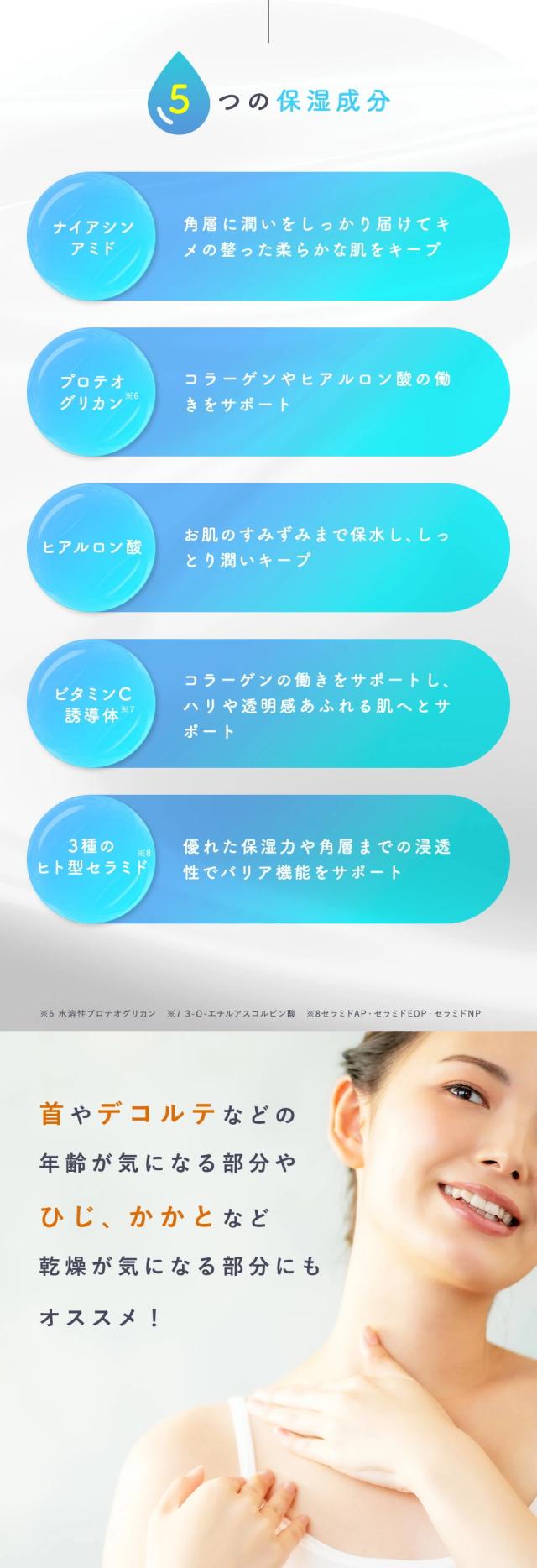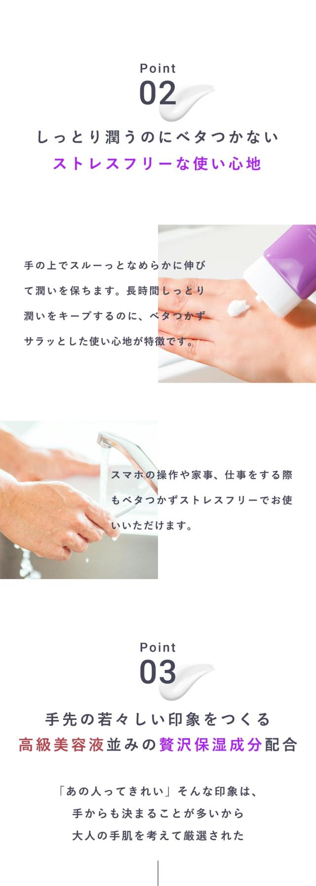 さらに、ヒアルロン酸Na・プロテオグリカン・ナイアシンアミド・ビタミンC誘導体などの保水・保湿成分がしっとりとした潤いのある手指をキープ。お顔用と同等の美容成分が含まれたハンドクリームなので、首やデコルテなどの気になる部分のポイントケアにもオススメです。