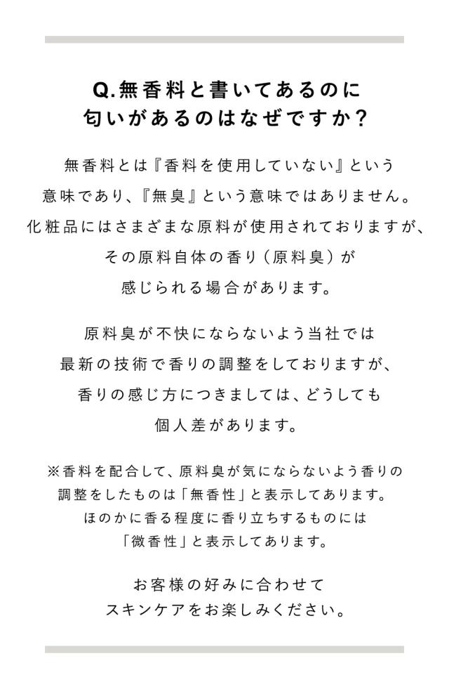 化粧品にはさまざまな原料が使用されており、その原料自体の香り(原料臭)を感じる方もいらっしゃいます。
