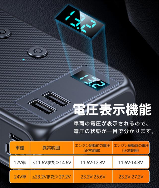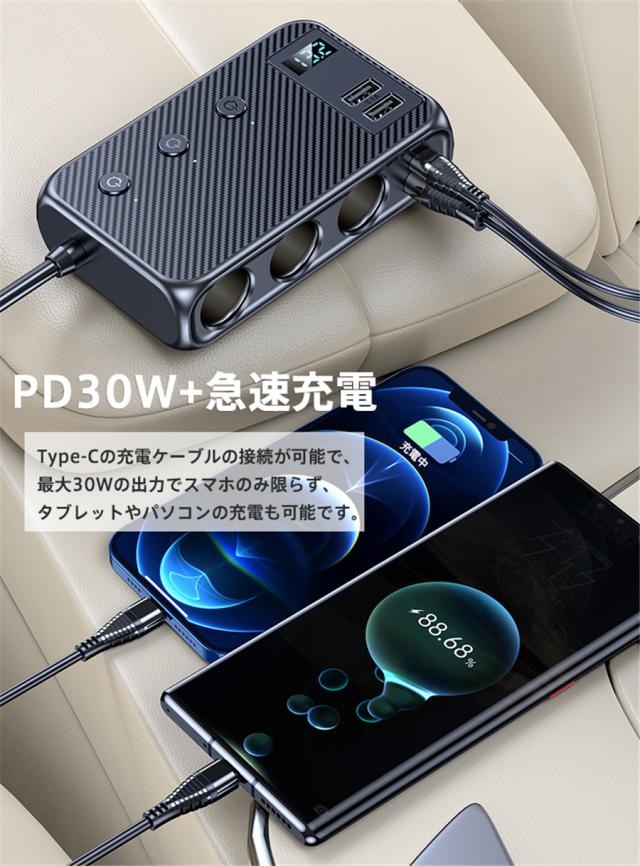 シガーソケット 3連 7in1 usbポート 128W 増設ソケット 車載充電器 PD30W 急速 12V/24V ト