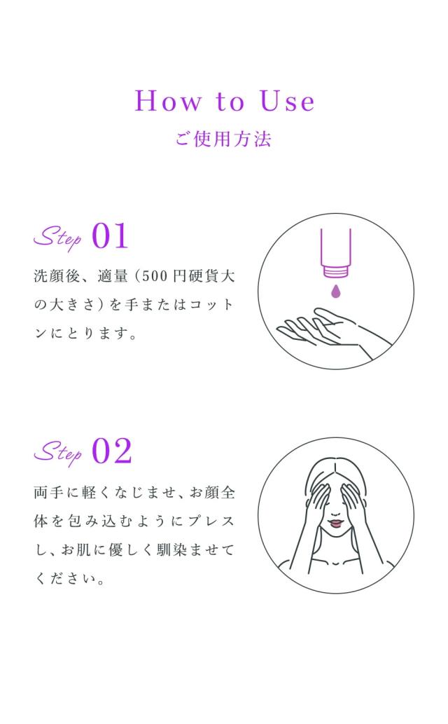 | 洗顔後、適量を手やコットンにとり、顔全体にやさしくなじませてください。 |