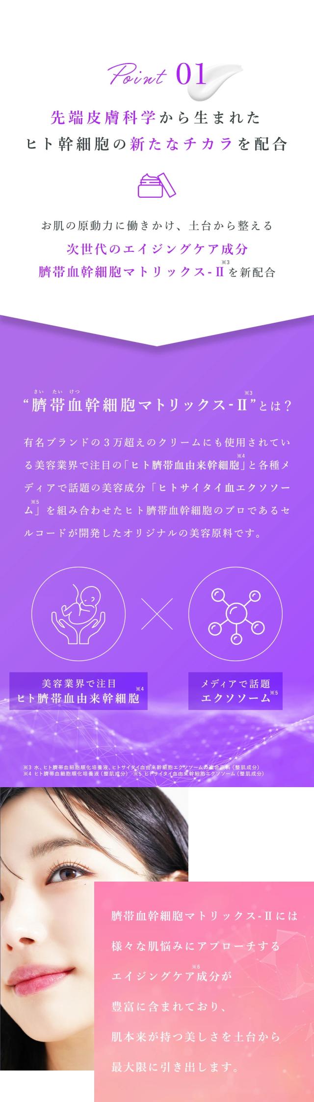 先端成分の中でも希少なヒト幹細胞「ヒト臍帯血細胞順化培養液」と「ヒトサイタイ間葉幹細胞順化培養液」に加え、今大注目の「幹細胞エクソソーム」を配合した高保湿エイジングケアクリームです。
