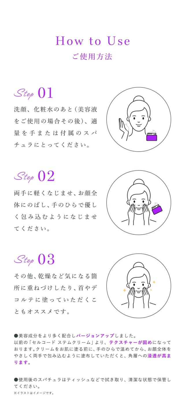 美容成分をより多く配合しバージョンアップしました。以前の「セルコード ステムクリーム」より、テクスチャーが固めになっております。クリームをお肌に塗る前に、手のひらで温めてから塗るようにすると角層への浸透力が高まります。お試しください。