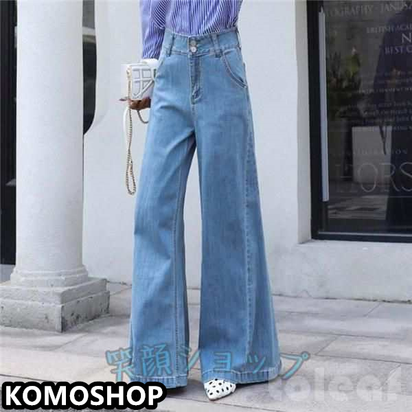 デニムワイドパンツレディースボトムスハイウエストジーンズベルボトム大きいサイズフレアストレッチきれいめゆったり美脚おしゃれ