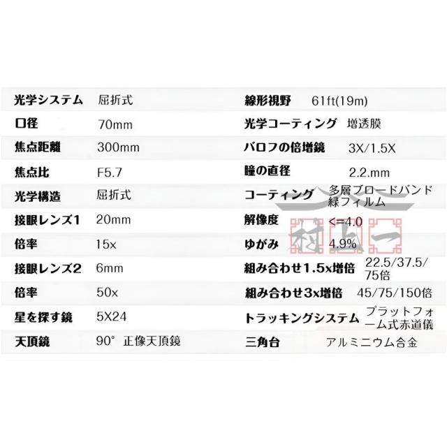 70mmの開口と300mmの焦点距離を持つ屈折天文望遠鏡。