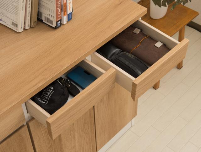3杯の引出しには、カトラリーや布巾、リビング周りの小物などを分けて収納できます。抜け落ち防止のストッパー付きで安心です。