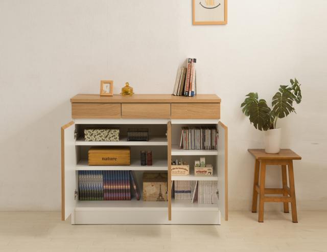 カウンター下にちょうど収まる高さのリビングボードです。同じシリーズのキャビネットなどと組み合わせば、まるで造り付けのような一体感です。キッチンやカウンター下だけでなく、玄関やリビングでのちょっとした収納として使用できます。
