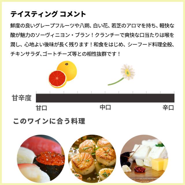 ![]() ■ぶどう品種:ソーヴィニヨン・ブラン100% ■発酵・熟成:ステンレスタンク醗酵、2ヶ月(シュール・リー)熟成 ハーブの香りと溢れんばかりのトロピカルフルーツのすばらしい香り!溌剌として充実した味わいと長い余韻のニュージーランド・ソーヴィニヨン・ブラン! 過去V.Tでもリアル・ワイン・ガイド旨安賞の経歴! 鮮度の良いグレープフルーツや八朔、白い花、若芝のアロマを持ち、軽快な酸が魅力のソーヴィニヨン・ブラン!クランチーで爽快な口当たりは喉を潤し、心地よい後味が長く残ります!高級マールボロ産のこだわりソーヴィニヨン・ブランが超お値打ち価格で限定で少量入荷!和食をはじめ、シーフード料理全般、チキンサラダ、ゴートチーズ等との相性抜群です! |