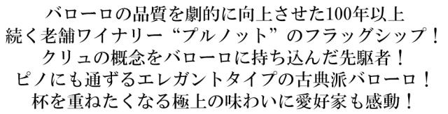 バローロの品質を劇的に向上させた100年以上 続く老舗ワイナリー“プルノット”のフラッグシップ! クリュの概念をバローロに持ち込んだ先駆者! ピノにも通ずるエレガントタイプの古典派バローロ! 杯を重ねたくなる極上の味わいに愛好家も感動!