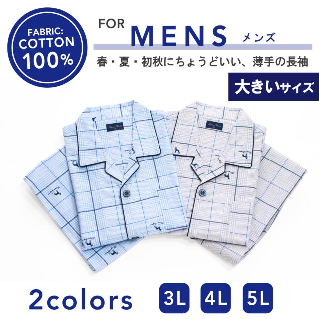 大きいサイズ パジャマ メンズ 綿100% 長袖 春 夏 初秋 前開き ボタン グレンチェック 犬柄 薄手のシャツ ブルー グレー 3L 4L 5L プレゼント 父の日