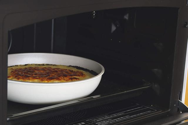 ハンドルを外して、そのままオーブンに入れることができます。グラタンなどのフライパンで調理したあとに、こんがりと焼き目を付けたいメニューに便利です。