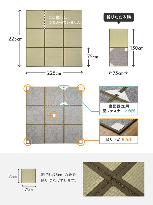 | 畳 マット 敷くだけ 置き畳 和室 ズレにくい 厚さ約1.1cm 約225×225cm たためる連結畳 鎌倉 9面 (H) |