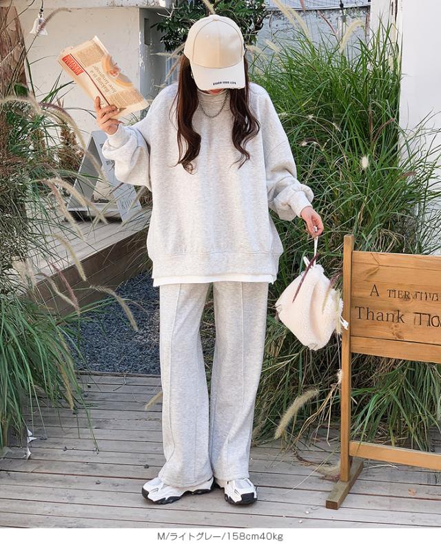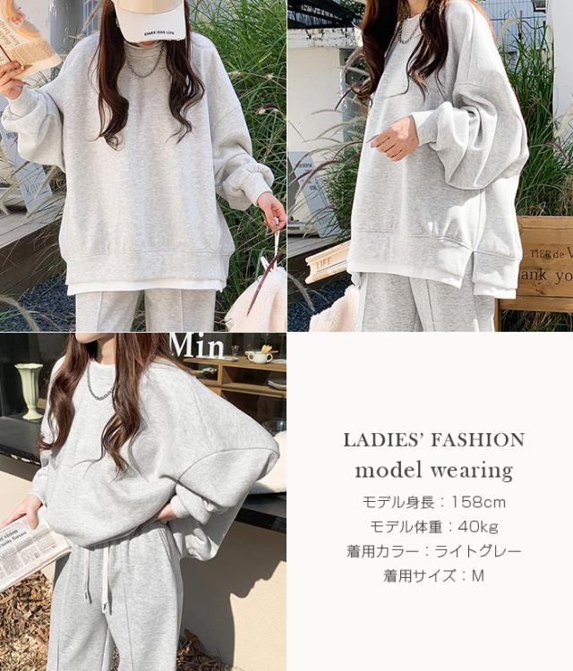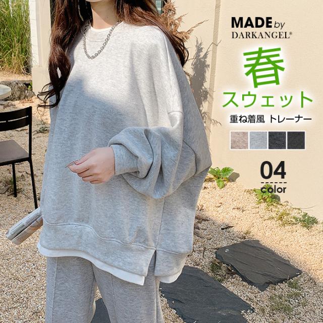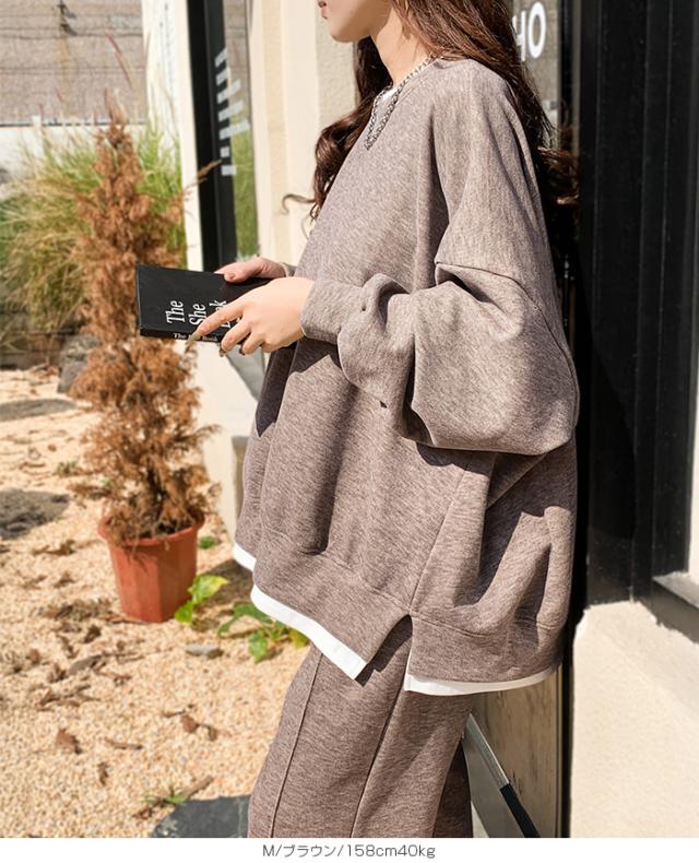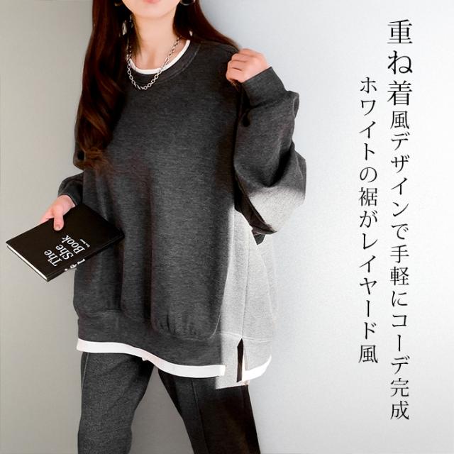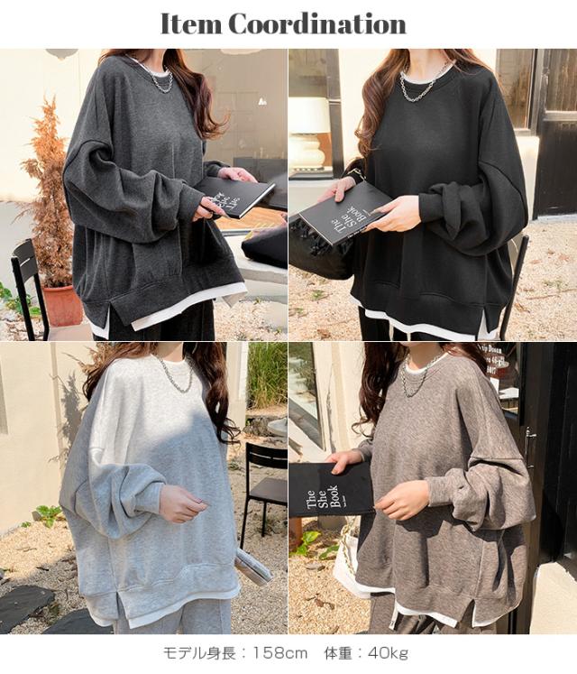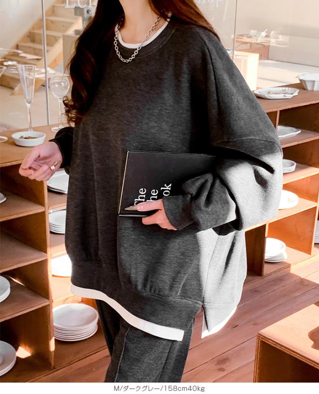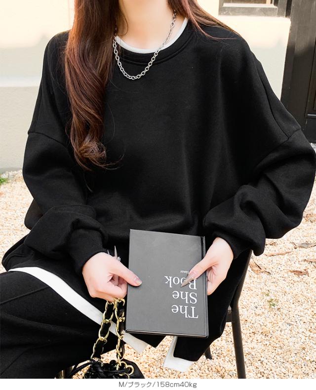 重ね着風デザインで手軽にコーデ完成 ホワイトの裾がレイヤード風に見えるデザインで、 1枚で簡単におしゃれなスタイルが完成します。 裏ミンクのふんわり裏起毛と裏起毛なしの2タイプ生地。 裏起毛タイプは寒い冬にも嬉しい抜群の保温性。 ミンクタッチの肌触りで快適さもUP! 裏起毛なしタイプは、春/秋など1枚でサマになるオーバーサイズトレーナーとして活躍します。 ゆったりシルエットでリラックス感 体のラインを拾わないデザインで、 リラックスした着心地と体型カバーを実現。 サイドスリット入りで動きやすい 軽やかさを演出するスリットデザインが、 おしゃれ感と動きやすさをプラス。 |