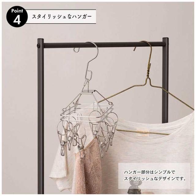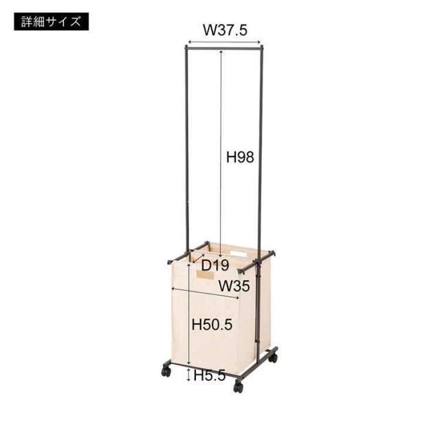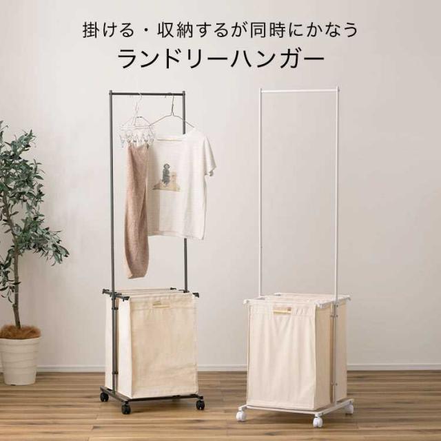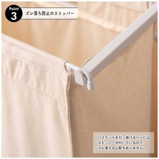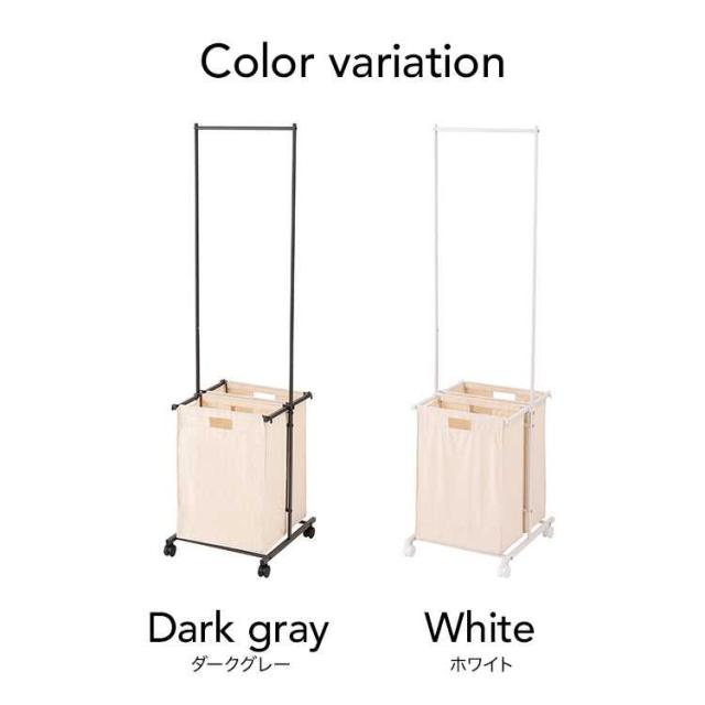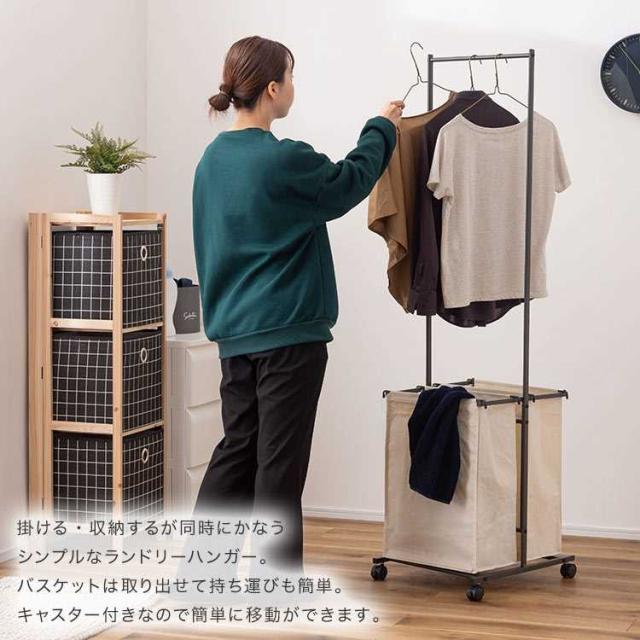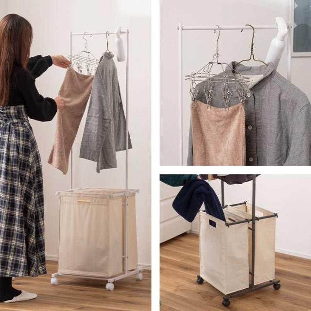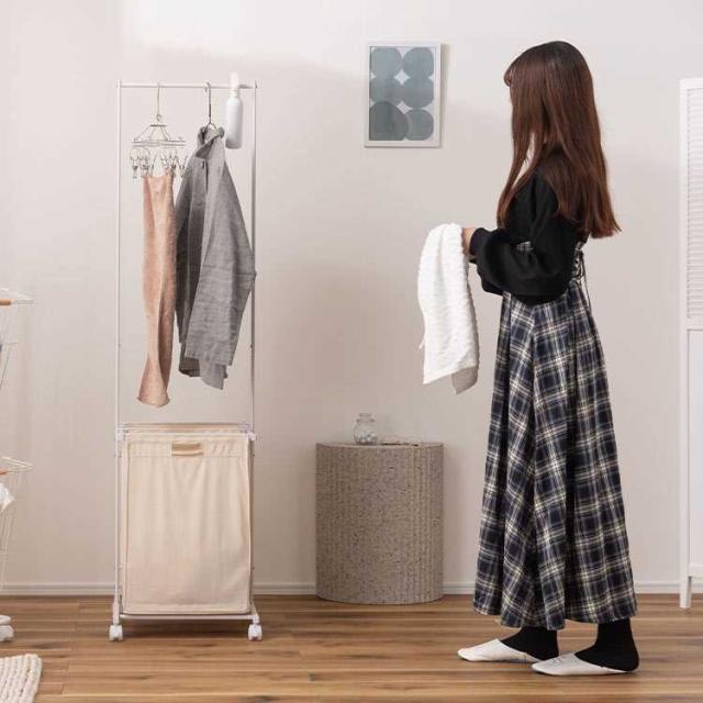 掛ける・収納するが同時にかなうシンプルなランドリーハンガー。バスケットは取り出すことができ持ち運びも簡単。キャスター付きなので移動も簡単。バスケットは下段に2個。それぞれ独立して取り外し可能。バスケットには取っ手が付いているので、持ち運び時にも便利。バスケットを引っ掛けるバーにはストッパーが付いているので、ズレ落ちる心配なし。ハンガー部分はシンプルでスタイリッシュなデザイン。