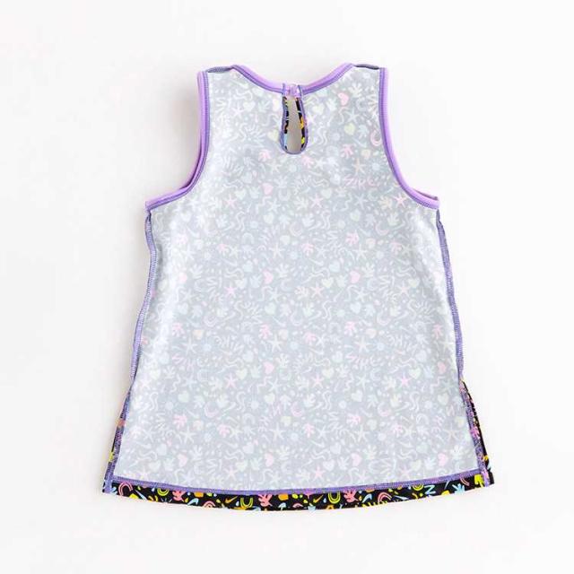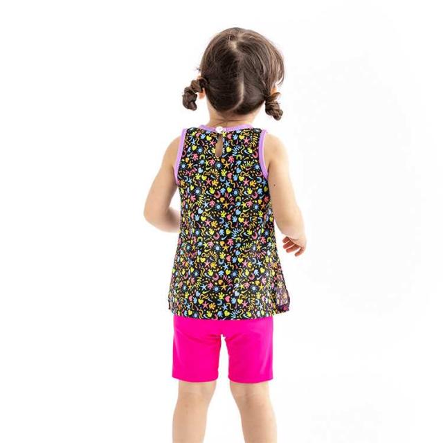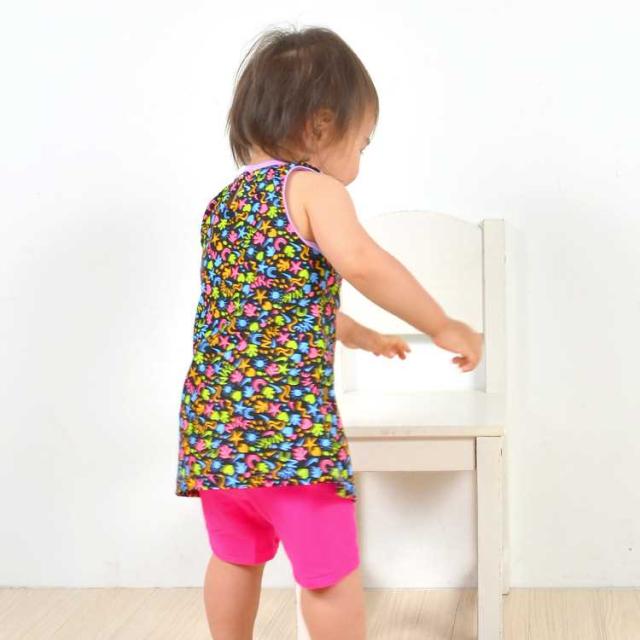 22'シーズンプリントが特徴的なトドラーガールズセパレートタイプの水着。トップス背面にあるボタンで着脱簡単。おなか周りはゆったりフィットで動きやすい。日焼け防止にピッタリなUPF50+。ボトムス股下は11cm(90cmサイズ)。バスト部分とクロッチ部分に裏地付属。