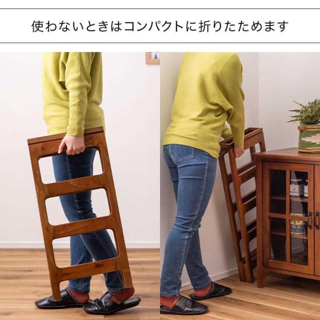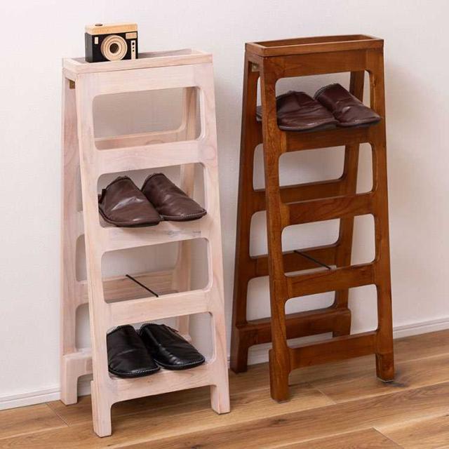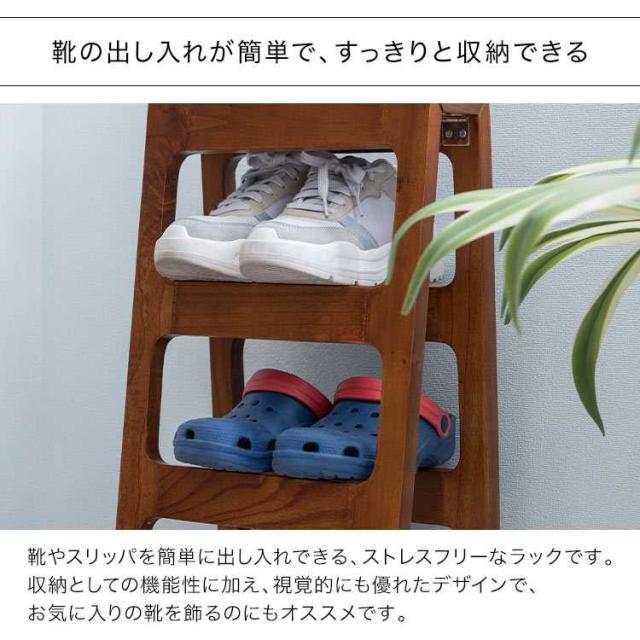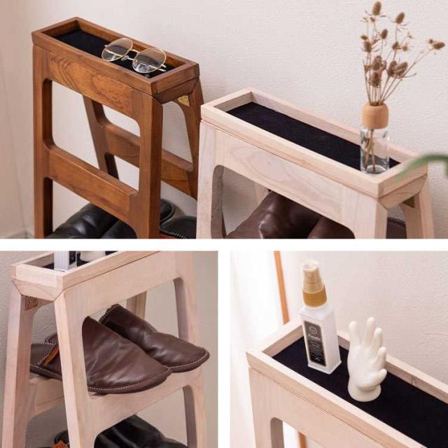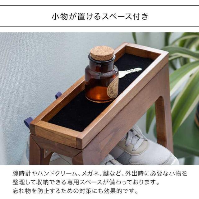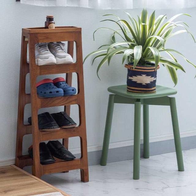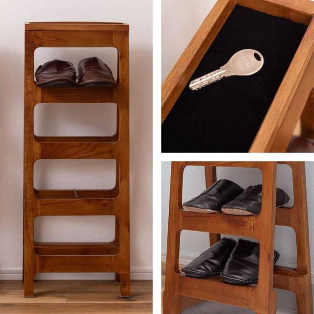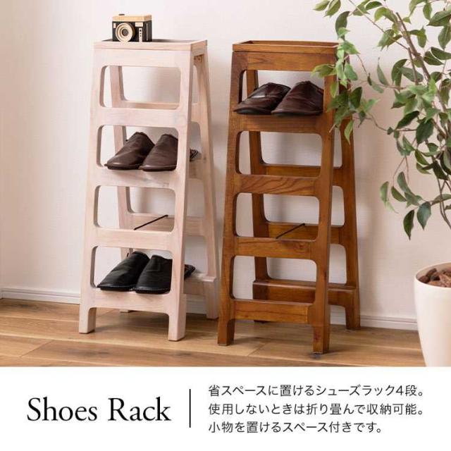 省スペースに置けるシューズラック4段。使用しないときは折り畳んで収納可能です。小物を置けるスペースも付いていて、忘れ物を防止するための対策にも効果的です。木製の温かみある素材感が、インテリアに自然に溶け込みます。